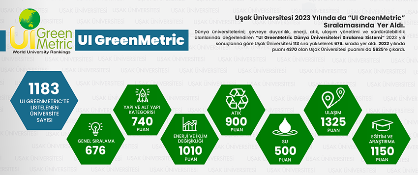 -“UI GreenMetric Dünya Üniversiteleri Sıralama Sistemi” 2023 yılı sonuçlarına göre Uşak Üniversitesi 113 sıra yükselerek 676. sırada yer aldı.-