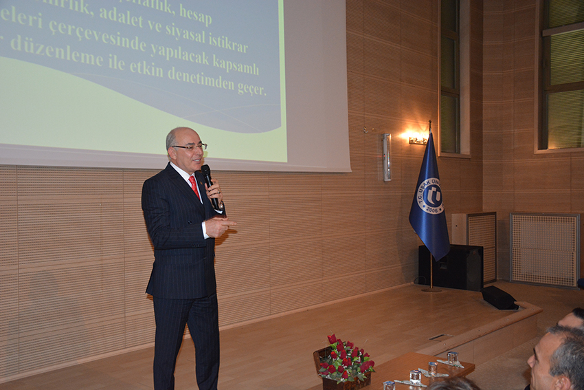 Prof. Dr. Mevlüt Karakaya, a graduate of the Faculty of Economics and Administrative Sciences at Gazi University and holder of a master's and doctorate degree in Accounting and Finance from the Institute of Social Sciences at Gazi University, examined the connection between development, finance, and democracy in his speech.