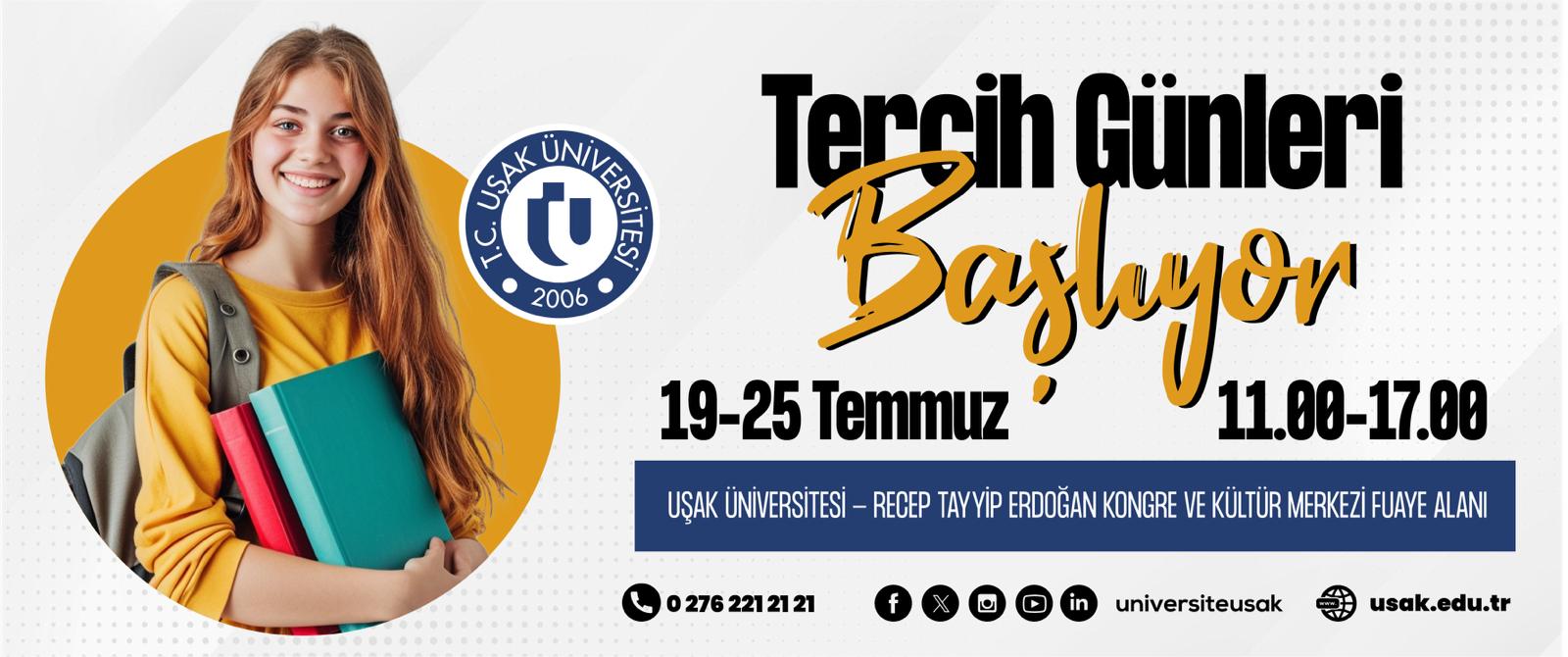Uşak Üniversitesi tarafından, Yükseköğretim Kurumları Sınavında (YKS) başarılı olan adaylara yönelik 19-25 Temmuz 2024 tarihleri arasında, Uşak Üniversitesi Bir Eylül Yerleşkesi, Recep Tayyip Erdoğan Kongre ve Kültür Merkezi Fuaye alanında “Uşak Üniversitesi Tercih Günleri” gerçekleştirilecek.