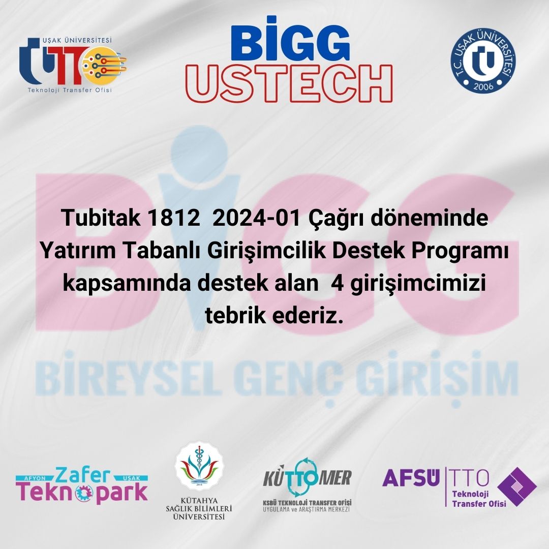 TÜBİTAK BİGG 2024 yılı 1. Çağrısı kapsamında 117 girişimciye ‘Mükemmeliyet Mührü’ verilmesi uygun bulundu. Bu girişimcilerin 4 tanesi de BİGG-USTECH projesi kapsamında uygulayıcı kuruluş olarak Uşak Üniversitesi tarafından desteklendi.
