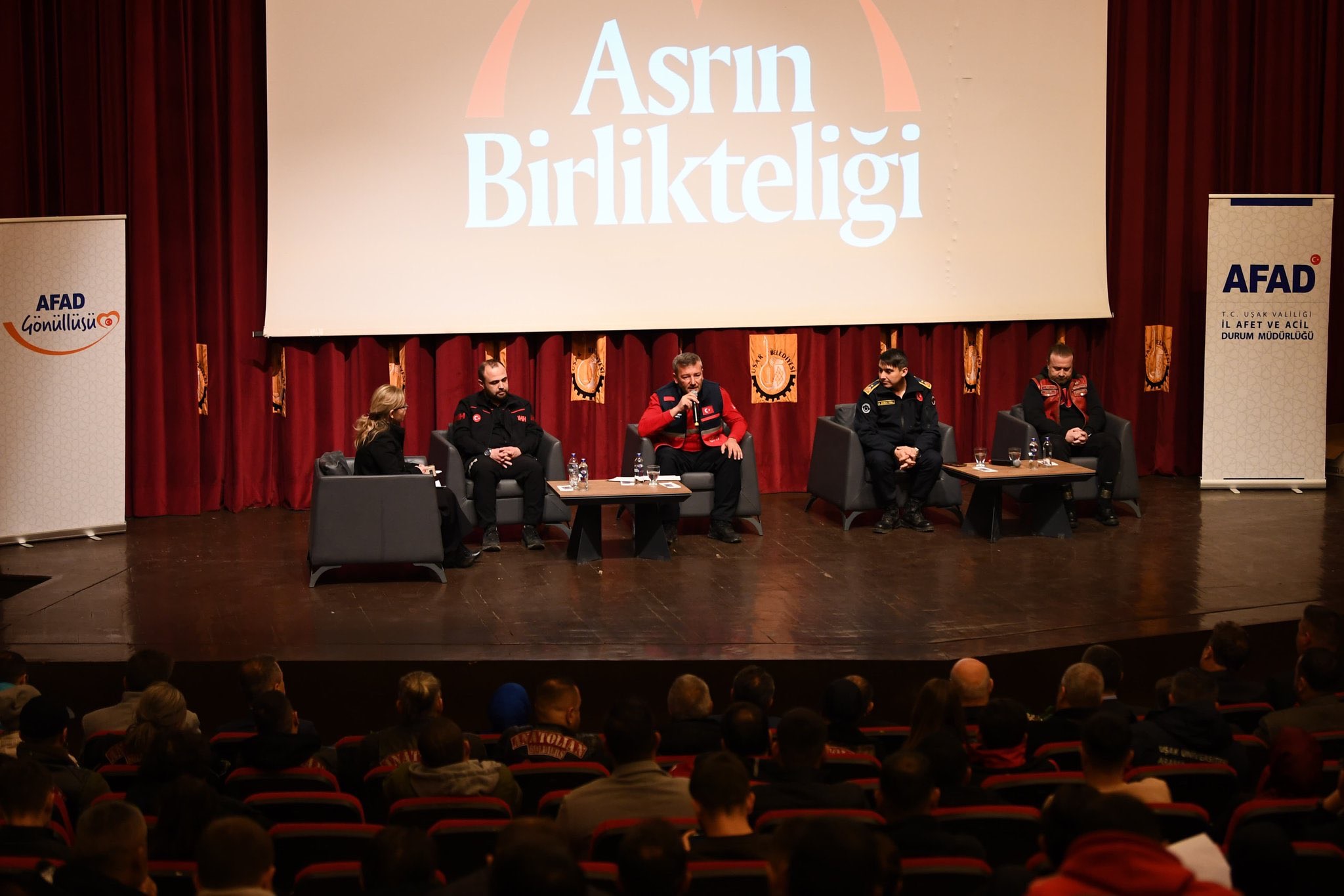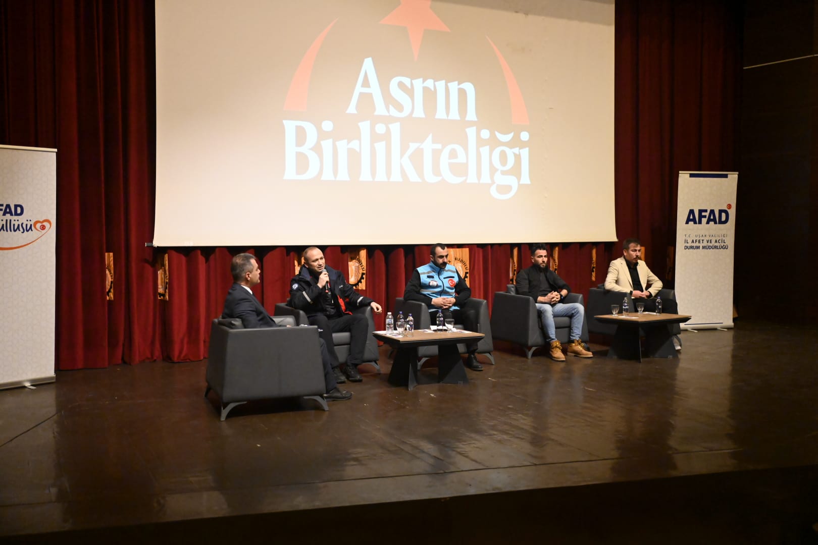 Moderatörlüğü Uşak Üniversitesi Deprem Uygulama ve Araştırma Merkezi Müdür Yardımcısı Doç. Dr. Zuhal Özçetin tarafından yürütülen birinci oturumda Ahmet Buran (İHH Arama Kurtarma Uşak), Osman Demir (MEB Arama Kurtarma Birimi), Ramazan Duran (Uşak Belediyesi, Uşak İtfaiyesi) ve Ertan Ertuğrul (Anadolu Kaplanları Motosiklet Kulübü) panelist olarak yer aldı. Deprem süresince yaşadıklarını, deneyimlerini ve yürüttükleri faaliyetleri anlattılar.