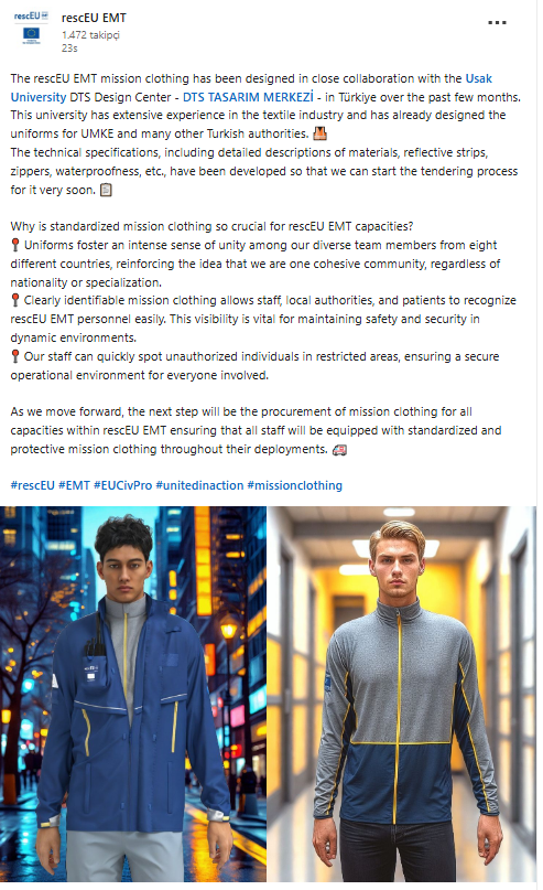 RescEU EMT ise konuyla ilgili profesyonel sosyal iş ağı ve sosyal paylaşım platformu LinkedIn hesabından yaptığı paylaşımda, Uşak Üniversitesi DTS Tasarım Merkezi (DTS TASARIM MERKEZİ ) ile işbirliği içinde kıyafet ve teçhizatların tasarım ve teknik şartnamelerinin tamamlandığını duyurdu. Paylaşımda Uşak Üniversitesi’nin tekstil endüstrisinde geniş deneyime sahip olduğunun altını çizen rescEU EMT, DTS Tasarım Merkezi’nin hâlihazırda Türkiye’deki birçok önemli kurumun üniformalarını da tasarladığını ifade etti. Kıyafetlerin teknik özelliklerinin DTS Tasarım Merkezi tarafından geliştirildiğini aktaran rescEU EMT paylaşımında standartlaştırılmış görev kıyafetlerinin rescEU EMT kapasiteleri için neden önemli olduğunu da belirtti.