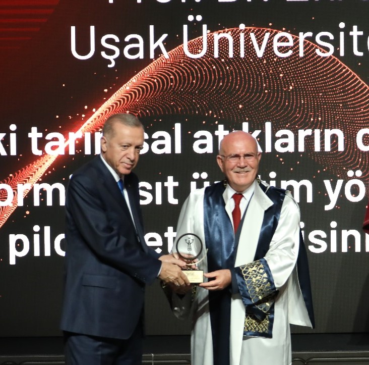 Uşak University, which won the 'Contribution to Local Development' award in the institutional category, added a new one to its achievements in regional development projects. Receiving their awards from President Recep Tayyip Erdoğan, Uşak University Rector Prof. Dr. Ekrem Savaş and Faculty of Engineering faculty member and project coordinator Prof. Dr. Yaşar Gök experienced great pride.