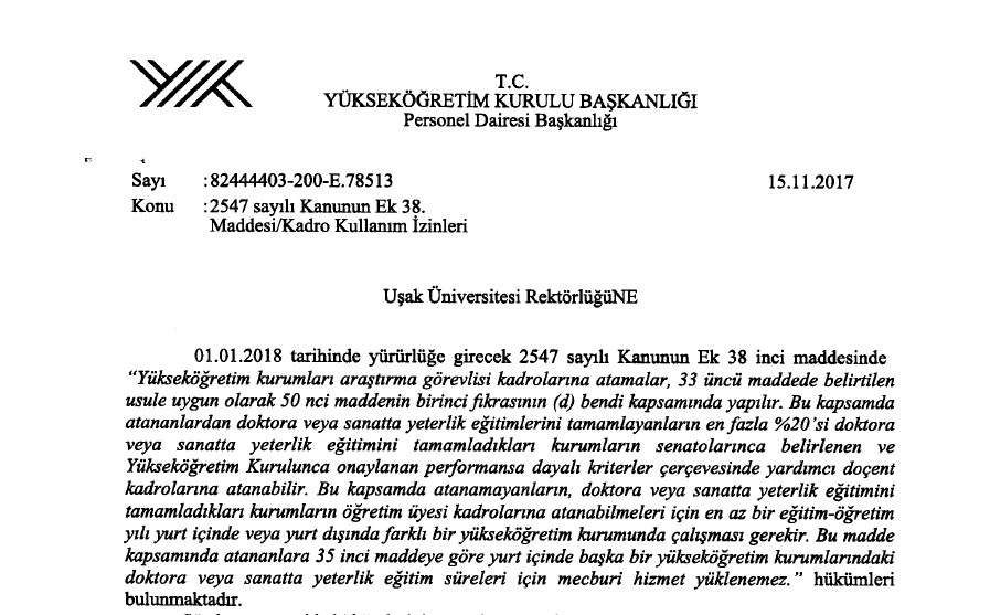 Ana Sayfa / Duyurular / 2547 Sayılı Kanun'un Ek 38. Maddesi/Kadro Kullanım İzinleri (YÖK)