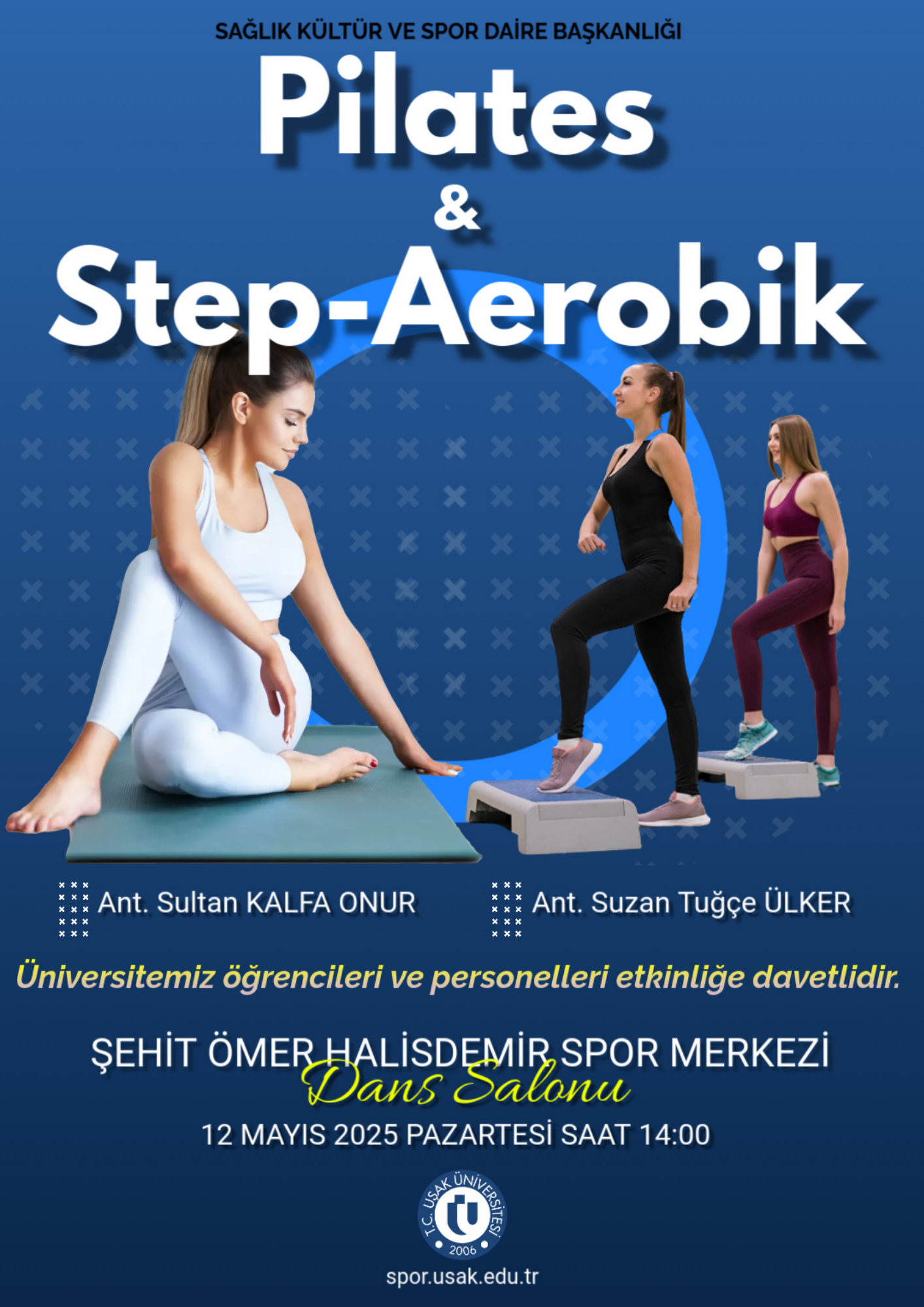 Tüm Üniversitemiz öğrenci ve personelinin davetli olduğu, Pilates & Step Aerobik etkinliği 12 Mayıs 2025 Pazartesi saat 14:00'da gerçekleşecektir.
