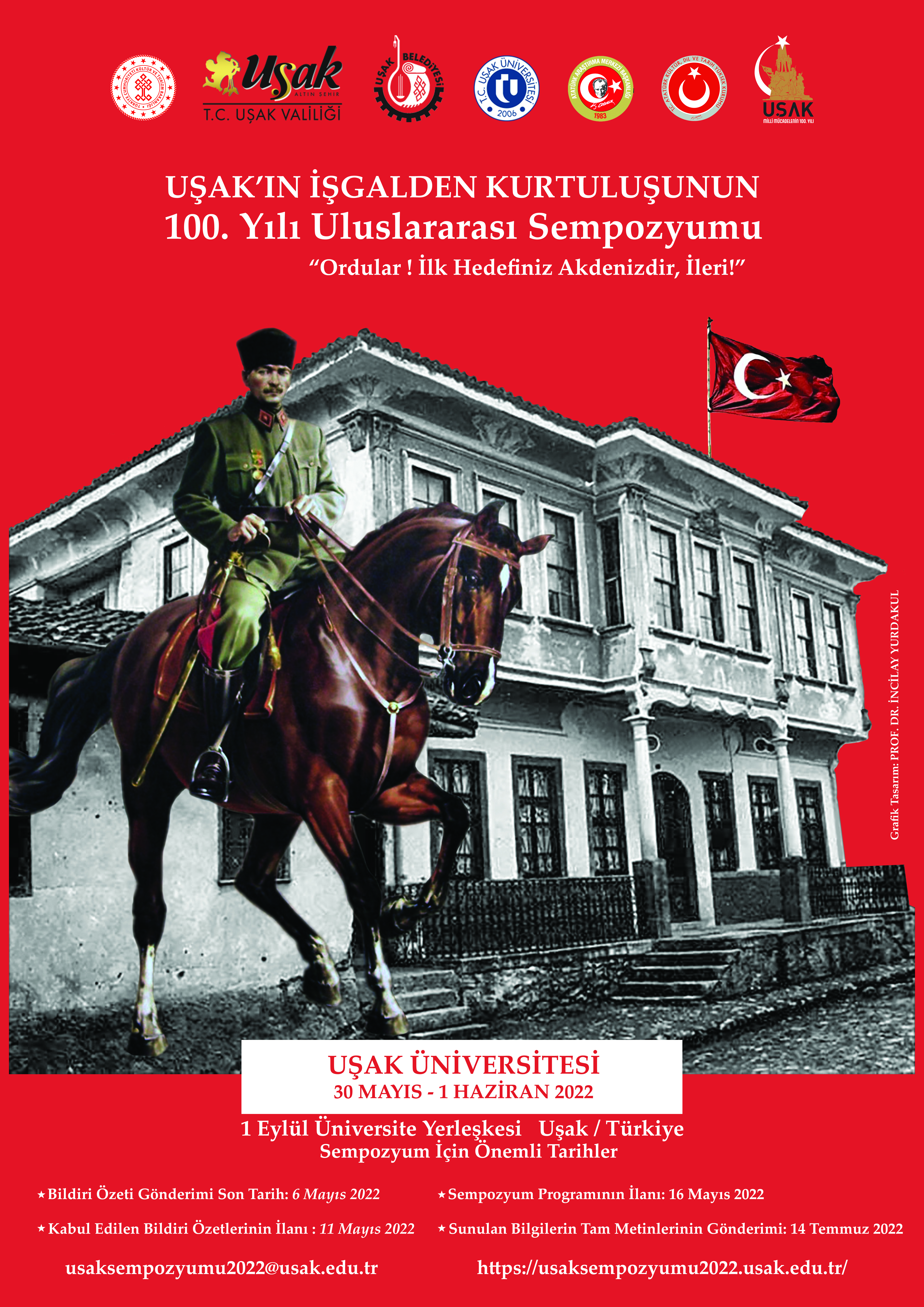 Atatürk Araştırma Merkezi Başkanlığının desteği, Uşak Valiliği, Uşak Belediye Başkanlığı ve Uşak Üniversitesi Rektörlüğünün iş birliğinde 30 Mayıs-1 Haziran 2022 tarihleri arasında “Uşak’ın İşgalden Kurtuluşunun 100. Yılı Uluslararası Sempozyumu” düzenlenecektir. Sempozyuma sizleri davet etmekten mutluluk ve onur duyarız.