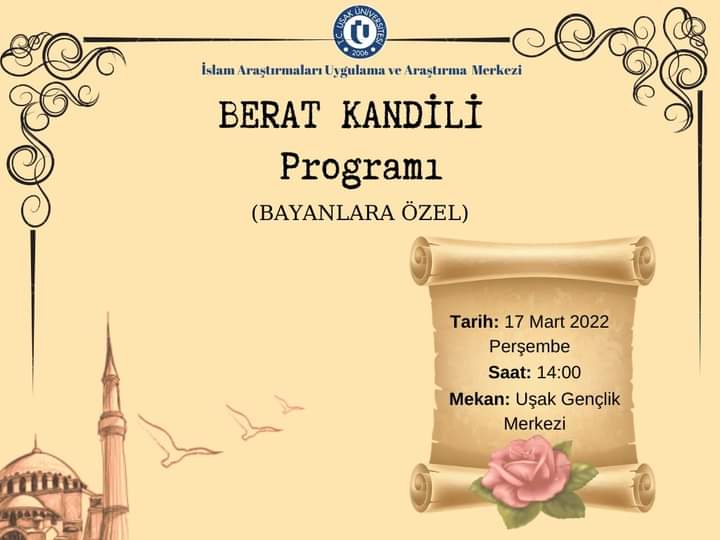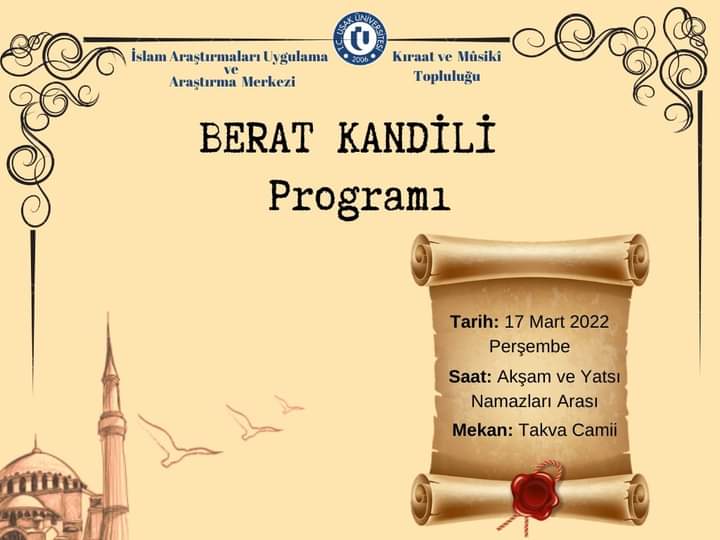 İslam Araştırmaları Uygulama ve Araştırma Merkezi ile Kıraat ve Musiki Topluluğu tarafından organize edilen İslami ilimler Fakültesi öğrencilerinin icra edeceği Berat Kandili Programına Üniversitemiz personeli ve öğrencilerimiz davetlidir.