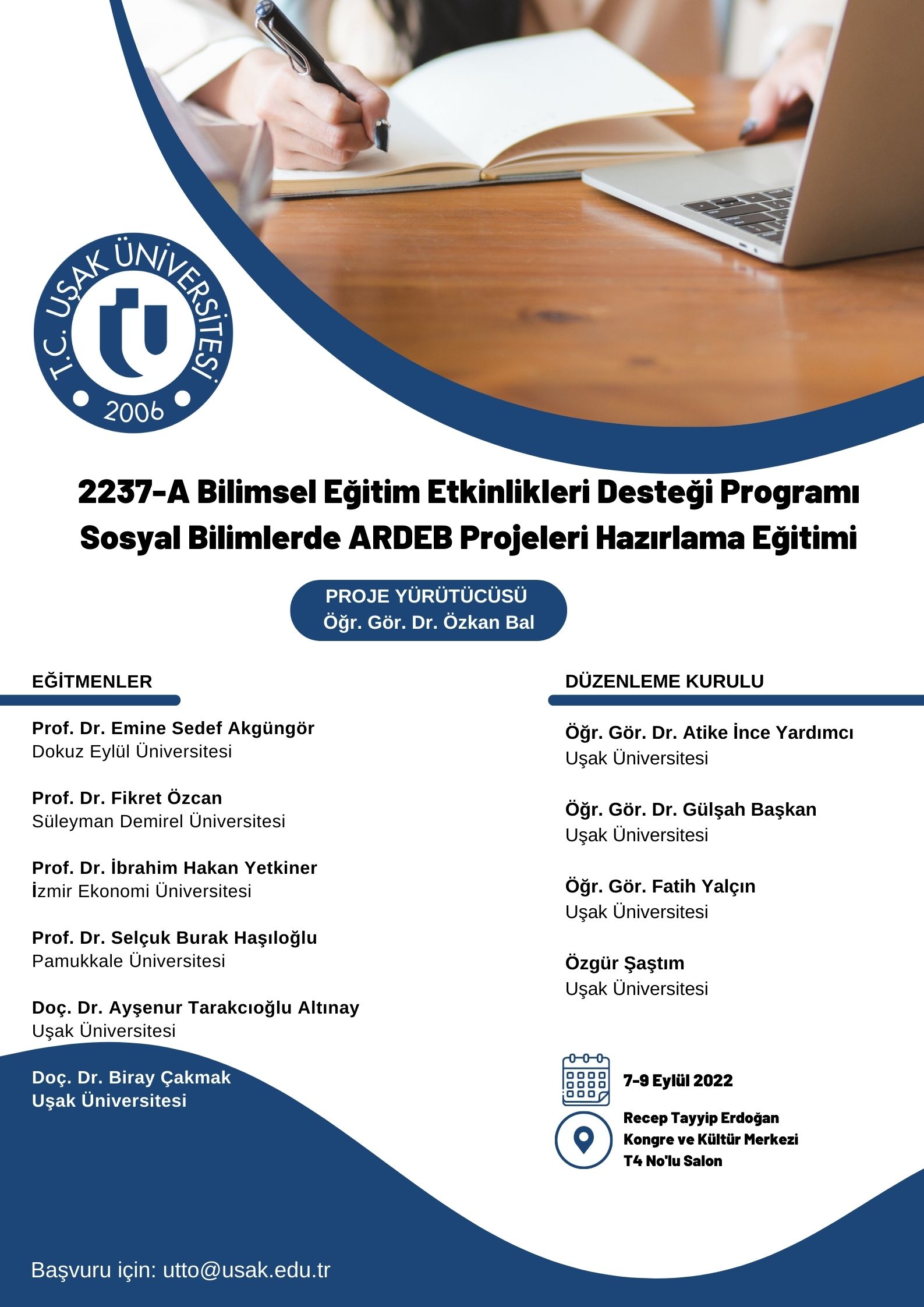 TÜBİTAK BİDEB 2237-A Bilimsel Eğitim Etkinlikleri Desteği kapsamında Uşak Üniversitesi Teknoloji Transfer Ofisi tarafından önerilen “Sosyal Bilimlerde ARDEB Projeleri Hazırlama Eğitimi ” konulu etkinlik 07-09 Eylül 2022 tarihleri arasında Uşak Üniversitesi Recep Tayyip Erdoğan Kongre ve Kültür Merkezi’nde gerçekleştirilecektir.