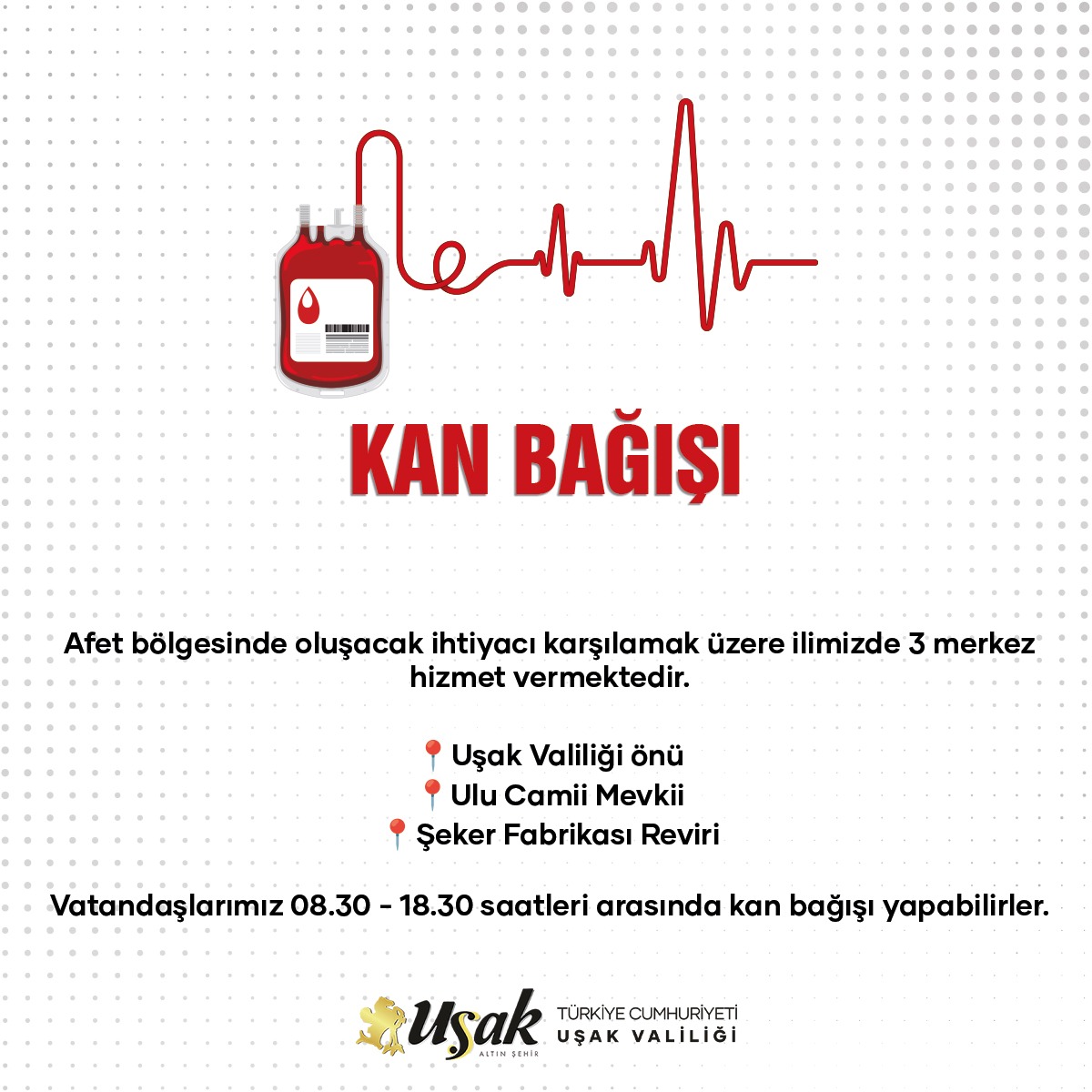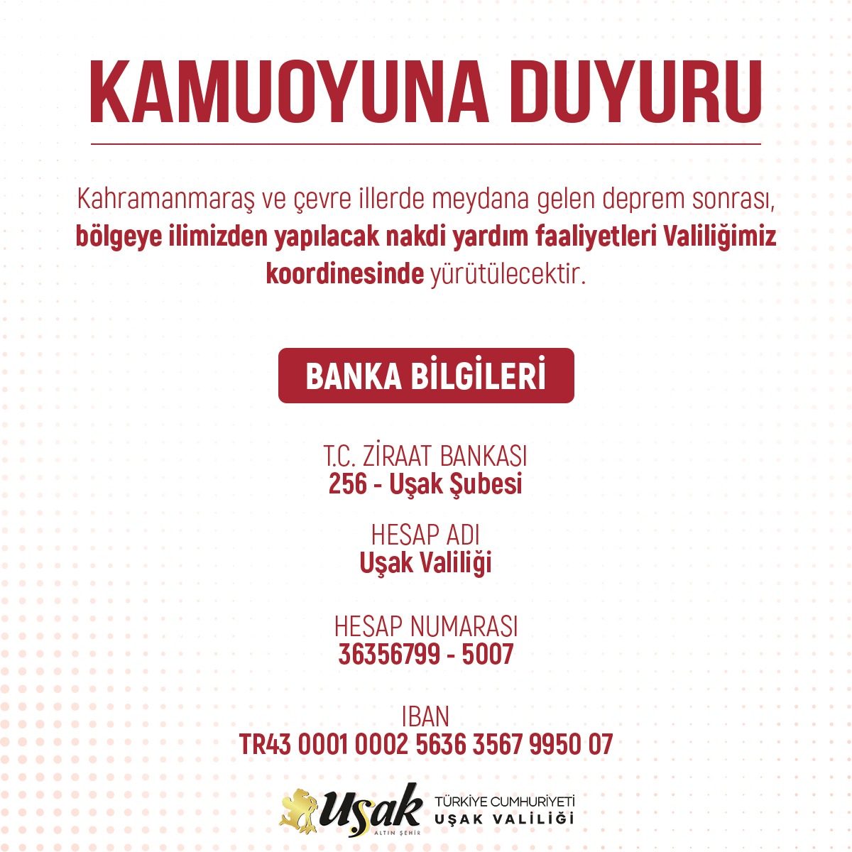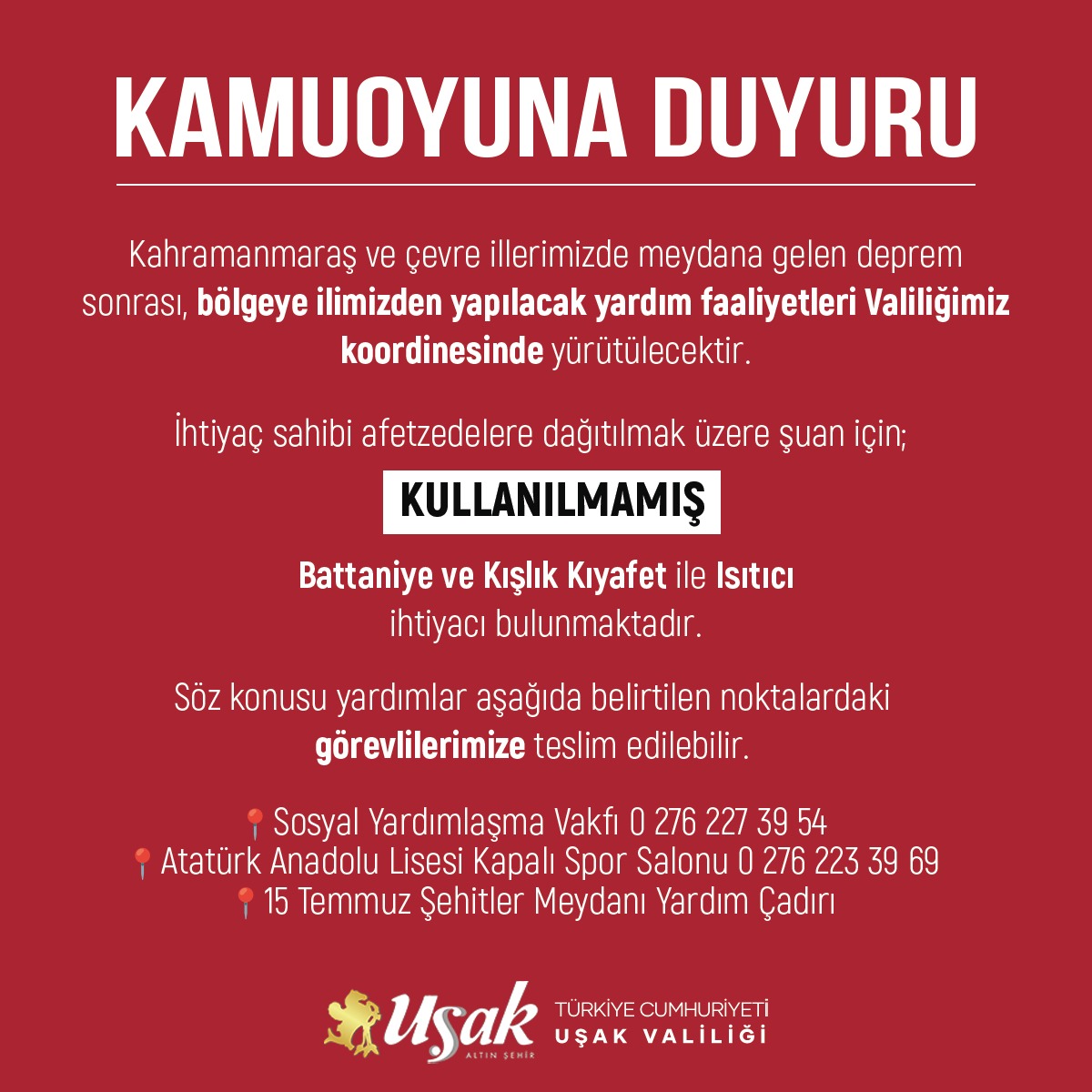 Kahramanmaraş ve çevre illerimizde meydana gelen deprem sonrası, bölgeye ilimizden yapılacak yardım faaliyetleri ( Battaniye, Kışlık Kıyafet, Nakdi Yardım ve Kan Bağışı gibi) Uşak Valiliğimizce yürütülmektedir. Katılım sağlamak isteyen personelimize duyurulur.