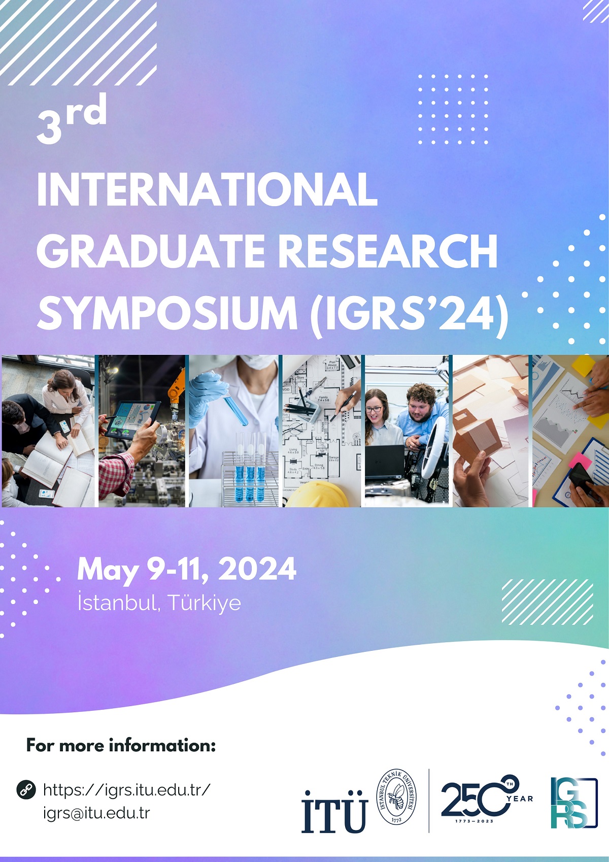 Mimarlık, mühendislik, sanat, sosyal bilimler ve fen bilimleri alanlarını kapsayan ULUSLARARASI LİSANSÜSTÜ ARAŞTIRMA SEMPOZYUMU - IGRS'24, 9-11 Mayıs tarihlerinde İstanbul Teknik Üniversitesi Enstitüsü tarafından çevrimiçi ve yüz yüze düzenlenecek. 2024. Sempozyum yüksek lisans ve doktora çalışmaları ile diğer tüm akademik çalışmalara açıktır.