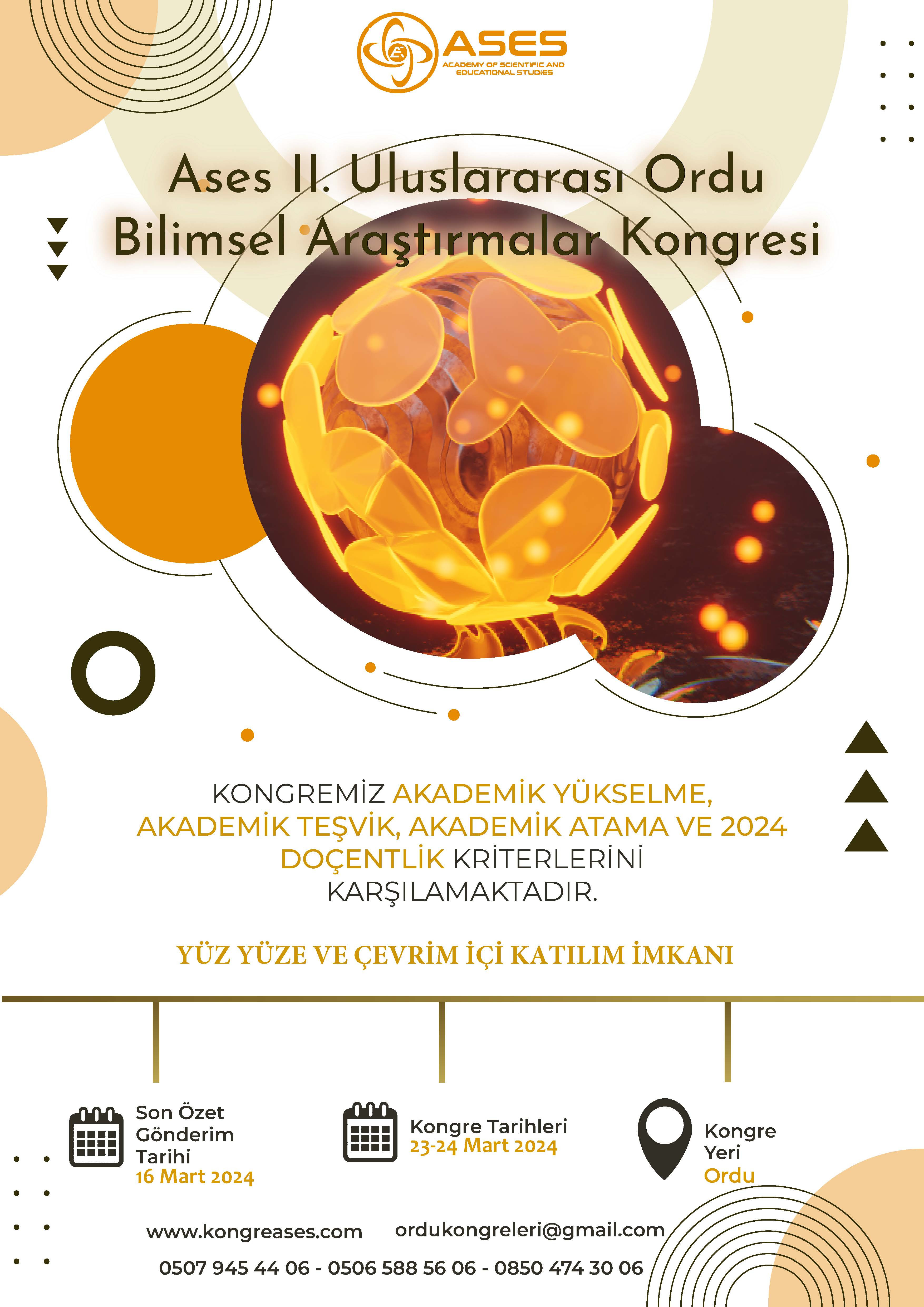 ASES (ACADEMY OF SCIENTIFIC AND EDUCATIONAL STUDIES) tarafından Ordu'da organize edilen II. Uluslararası Ordu Bilimsel Araştırmalar Kongresi için başvurusu alınan çalışmalar çift kör hakemlik yöntemiyle hassas bir şekilde değerlendirilir. Türkçe, İngilizce, Rusça ve Arapça yazım ve sunum dili olarak belirlenmiştir. Kongremiz 2024 doçentlik kriterine uygun ve profesörlük kadrolarına atanma dahil olmak üzere ilgili kurumların akademik yükselme kriterlerini sağlamaktadır. Kongremiz akademik teşviğe uygundur. 26 ülkeye kongre çağrısına çıkılmıştır. Türkiye için ayrılan kontenjan %45 dir. Kongremizin ardından ISBN bildirilerinin yayınlanması ile bu Uluslararası Bilim Şenliğine katılımınız bizi onurlandıracaktır.