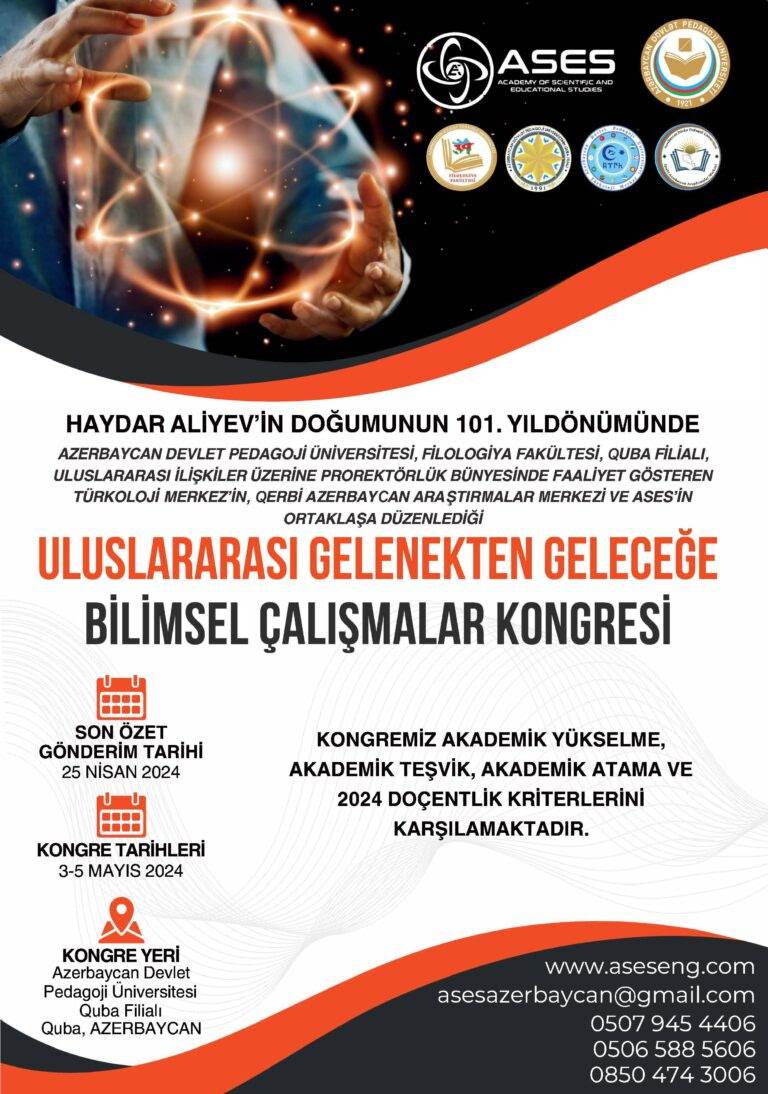 Azerbaycan Devlet Pedagoji Üniversitesi Filologiya Fakültasi Quba Filialı Uluslararası İlişkiler Üzerine Prorektörlük Bünyesinde Faaliyet Gösteren Türkoloji Merkezi'nin Qerbi Azerbaycan Araştırmalar Merkezi olarak düzenleyeceğimiz, ASES (ACADEMY OF SCIENTIFIC AND EDUCATIONAL STUDIES) tarafından organize edilen Uluslararası Gelenekten Geleceğe Bilimsel Çalışmalar Kongresine gönderilen çalışmalar çift kör hakemlik yöntemiyle hassas bir şekilde değerlendirilir. Değerlendirme sonucu üç gün içinde yazara bildirilir. Kongremizin yazım ve sunum dili Türkçe, İngilizce, Rusça ve Arapça olarak belirlenmiştir. Kongremiz 2024 doçentlik kriterine uygun ve profesörlük kadrolarına atanma dahil olmak üzere ilgili kurumların akademik yükselme kriterlerini sağlamakta olup Kongremiz akademik teşviğe uygundur. 26 ülkeye kongre çağrısına çıkılmış ve şu ana kadar 15 ülkeden çalışmalar gelmiştir. Türkiye için ayrılan kontenjan %45 dir. Kongremiz Bandırma Onyedi Eylül Üniversite Kampüsünde gerçekleştirilecektir. Üniversitemiz ve ASES tararafından düzenlenen bu Uluslararası Bilim Şenliğine katılımınız bizi onurlandıracaktır.