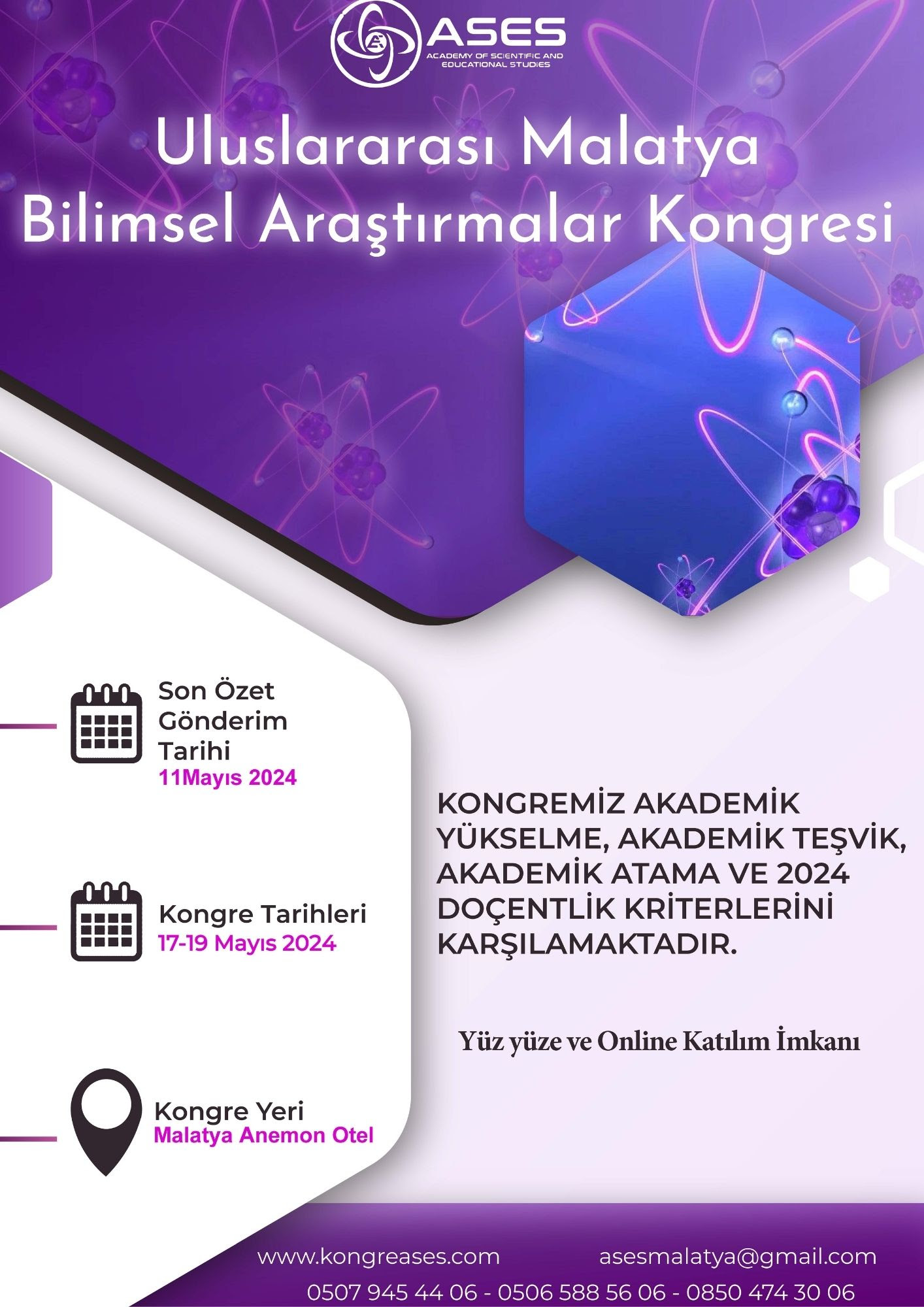 ASES (ACADEMY OF SCIENTIFIC AND EDUCATIONAL STUDIES) tarafından organize edilen Uluslararası Malatya Bilimsel Araştırmalar Kongresi 18 Mayıs 2024 tarihinde Malatya Anemon Otel'de yüz yüze, 17-19 Mayıs 2024 tarihleri arasında zoom üzerinden online olarak katılabilirsiniz. Kongre için başvurusu alınan çalışmalar çift kör hakemlik yöntemiyle hassas bir şekilde değerlendirilir.Türkçe, İngilizce, Rusça ve Arapça yazım ve sunum dili olarak belirlenmiştir. Kongremiz 2024 doçentlik kriterine uygun ve profesörlük kadrolarına atanma dahil olmak üzere ilgili kurumların akademik yükselme kriterlerini sağlamaktadır. Kongremiz akademik teşviğe uygundur. 26 ülkeye kongre çağrısına çıkılmıştır. Türkiye için ayrılan kontenjan %45 dir. Kongremizin ardından 29 Mayıs 2024 tarihinde ISBN'li Kongre Kitabı yayınlanacaktır. Kongremize katılımınız bizi onurlandıracaktır.