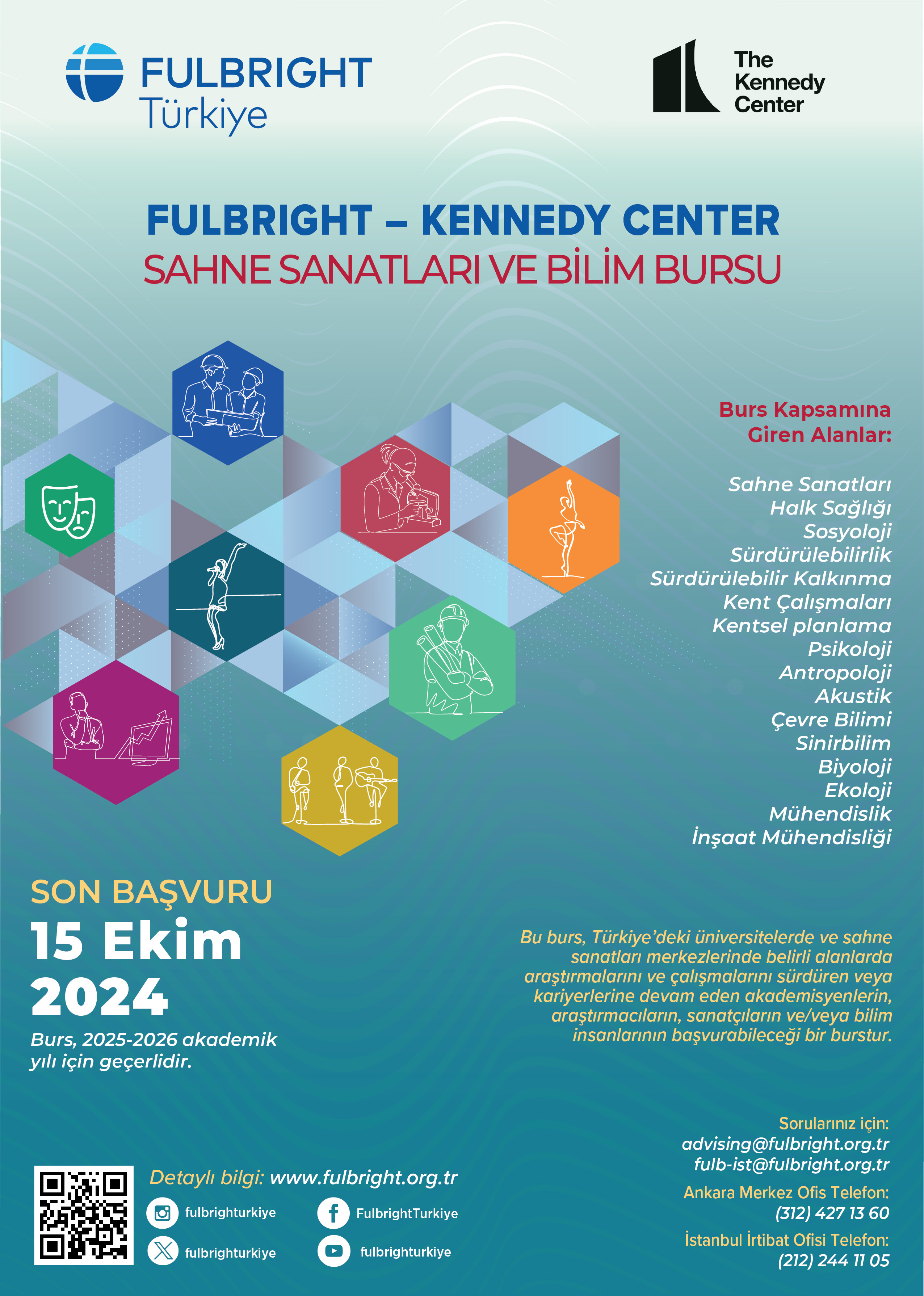 Fulbright – Kennedy Center Sahne Sanatları ve Bilim Bursu; Türkiye’deki üniversitelerde ve sahne sanatları merkezlerinde belirli alanlarda araştırmalarını ve çalışmalarını sürdüren veya kariyerlerine devam eden akademisyenlerin, araştırmacıların, sanatçıların ve/veya bilim insanlarının başvurabileceği bir burstur.
