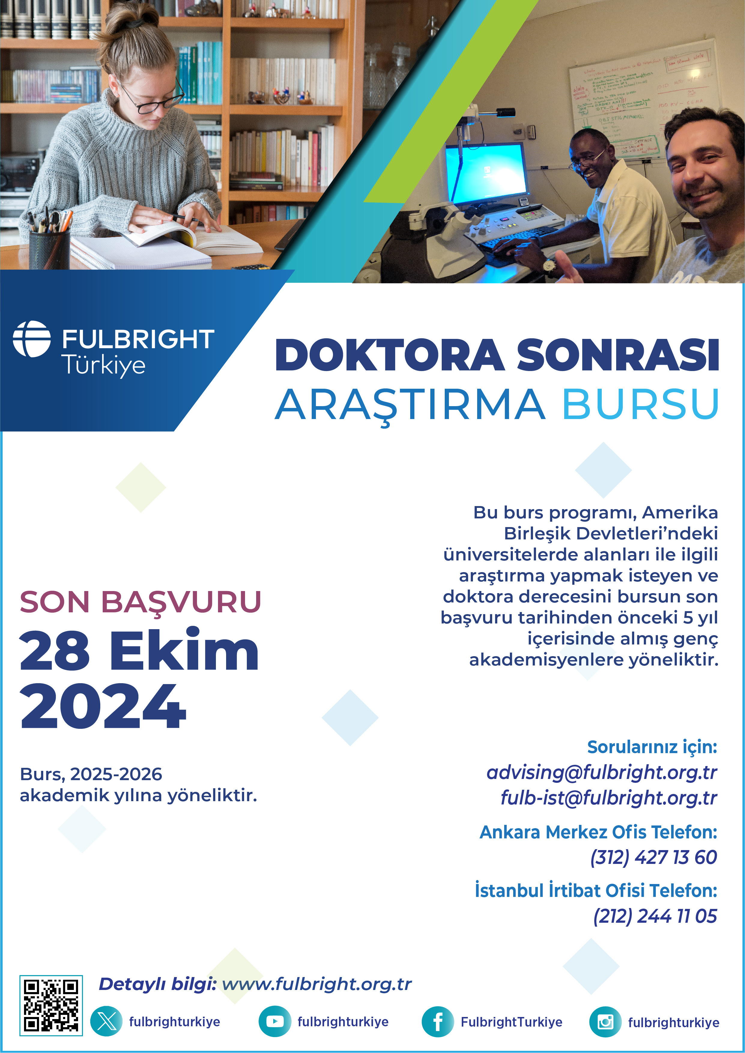 Başvurulara yeni açılmış olan Doktora Sonrası Araştırma Bursuna, doktorasını son beş yıl içinde almış genç akademisyenler, alanlarıyla ilgili ABD’de araştırma yapmak üzere başvuru yapabilirler. 2025-2026 akademik yılına yönelik verilecek bu burs için son başvuru tarihi 28 Ekim 2024’tür.