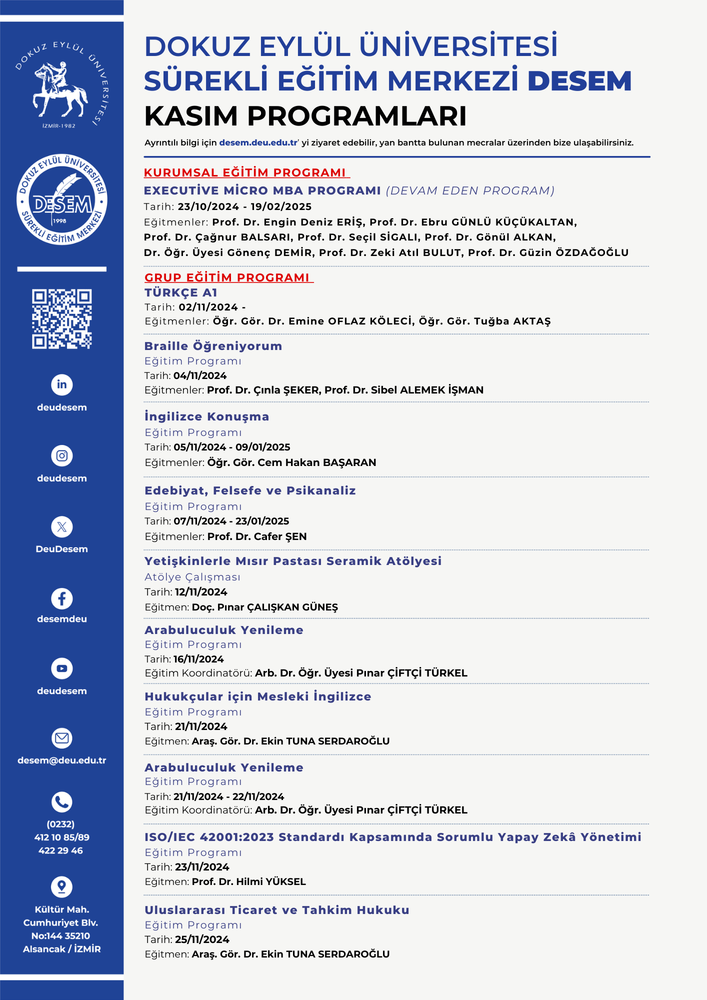 Dokuz Eylül Üniversitesi Sürekli Eğitim Merkezi 2024 Yılı Kasım Ayı Eğitim Programı