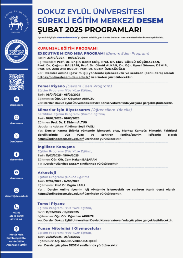 Ana Sayfa / Duyurular / Dokuz Eylül Üniversitesi Sürekli Eğitim Merkezi 2025 Yılı Şubat Ayı Eğitim Programı