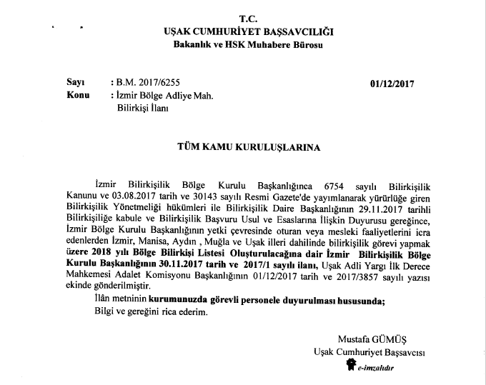 Ana Sayfa / Duyurular / İzmir Bölge Adliye Mah. Bilirkişi İlanı
