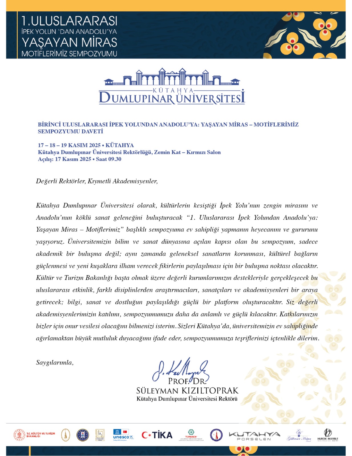 Kütahya Dumlupınar Üniversitesi Rektörlüğünün ev sahipliğinde düzenlenecek olan “1. Uluslararası İpek Yolundan Anadolu’ya: Yaşayan Miras – Motiflerimiz” başlıklı sempozyuma sizleri davet etmekten onur duyarız.