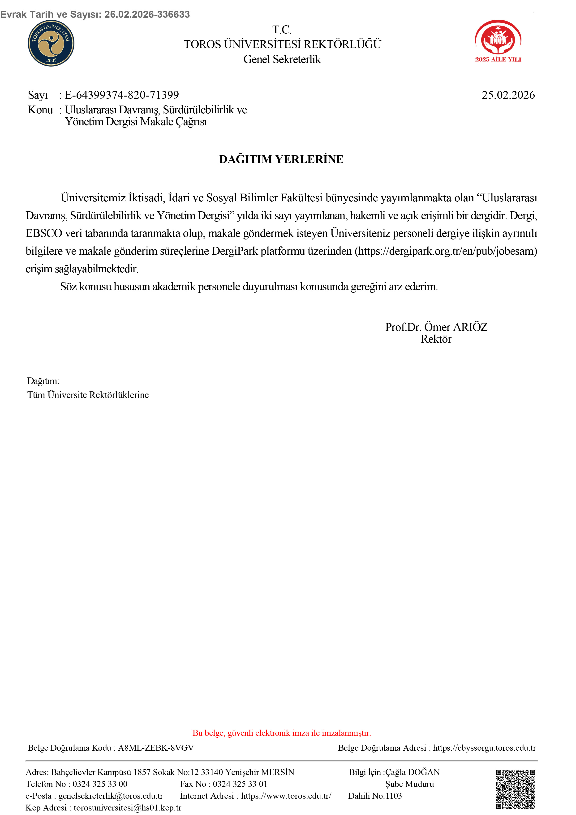 Uluslararası Davranış, Sürdürülebilirlik ve Yönetim Dergisi Makale Çağrısı