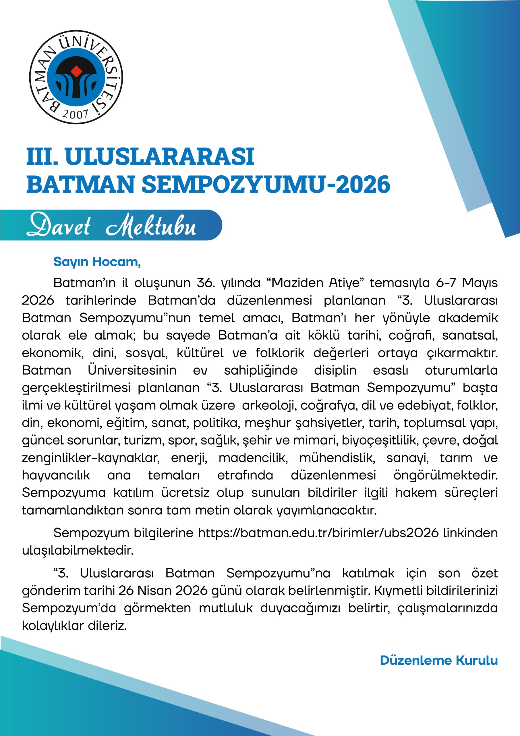 Ana Sayfa / Duyurular / 3. Uluslararası Batman Sempozyumu Hk.