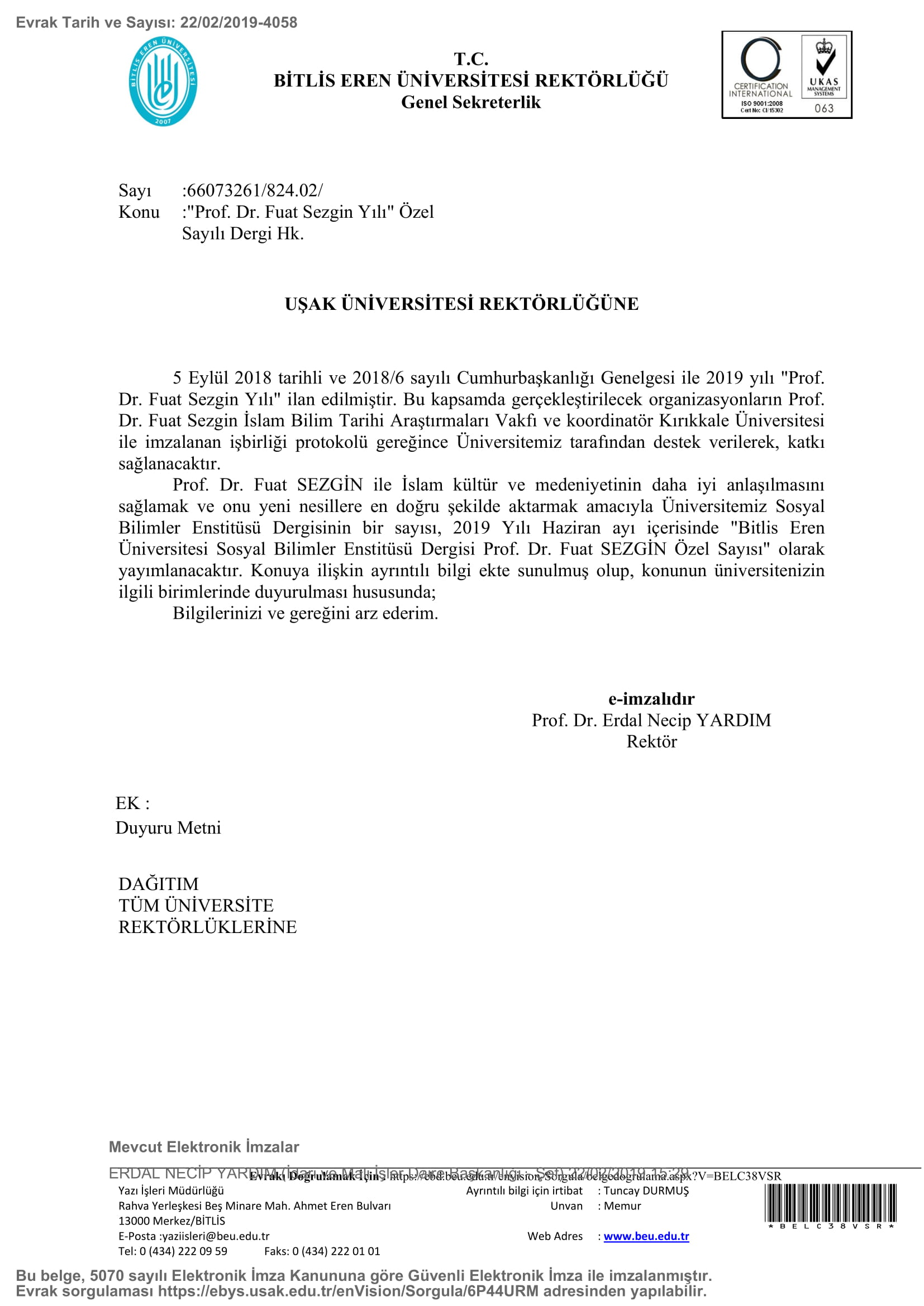 Prof. Dr. Fuat Sezgin Yılı Özel Sayılı Dergi Hk.