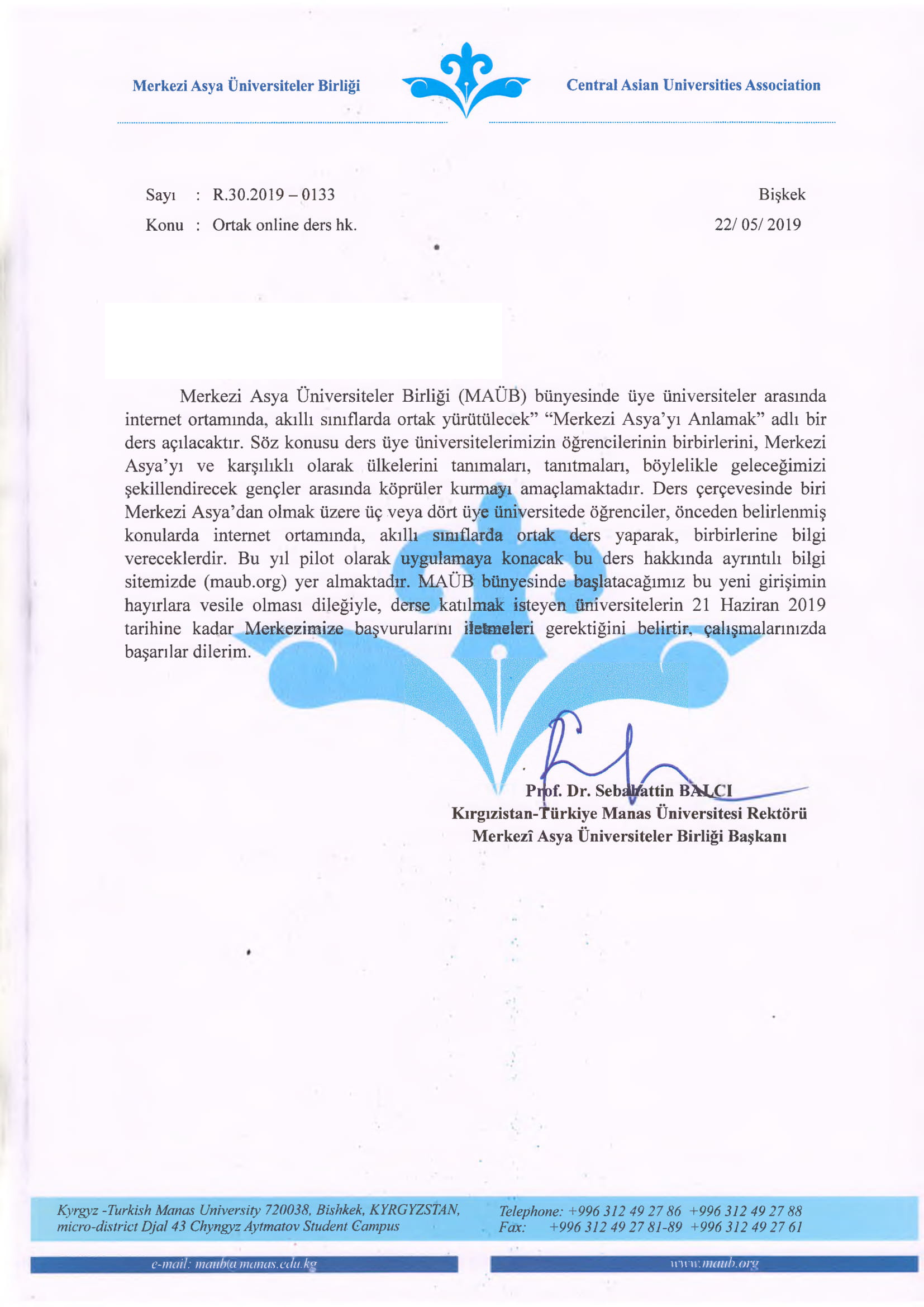 Merkezi Asya Üniversiteler Birliği (MAÜB) bünyesinde üye üniversiteler arasında internet ortamında, akıllı sınıflarda ortak yürütülecek” “Merkezi Asya’yı Anlamak” adlı bir ders açılacaktır. Söz konusu ders üye üniversitelerimizin öğrencilerinin birbirlerini, Merkezi Asya’yı ve karşılıklı olarak ülkelerini tanımaları, tanıtmaları, böylelikle geleceğimizi şekillendirecek gençler arasında köprüler kurmayı amaçlamaktadır. Ders çerçevesinde biri Merkezi Asya’dan olmak üzere üç veya dört üye üniversitede öğrenciler, önceden belirlenmiş konularda internet ortamında, akıllı sınıflarda ortak ders yaparak, birbirlerine bilgi vereceklerdir. Bu yıl pilot olarak uygulamaya konacak bu ders hakkında ayrıntılı bilgi sitemizde
