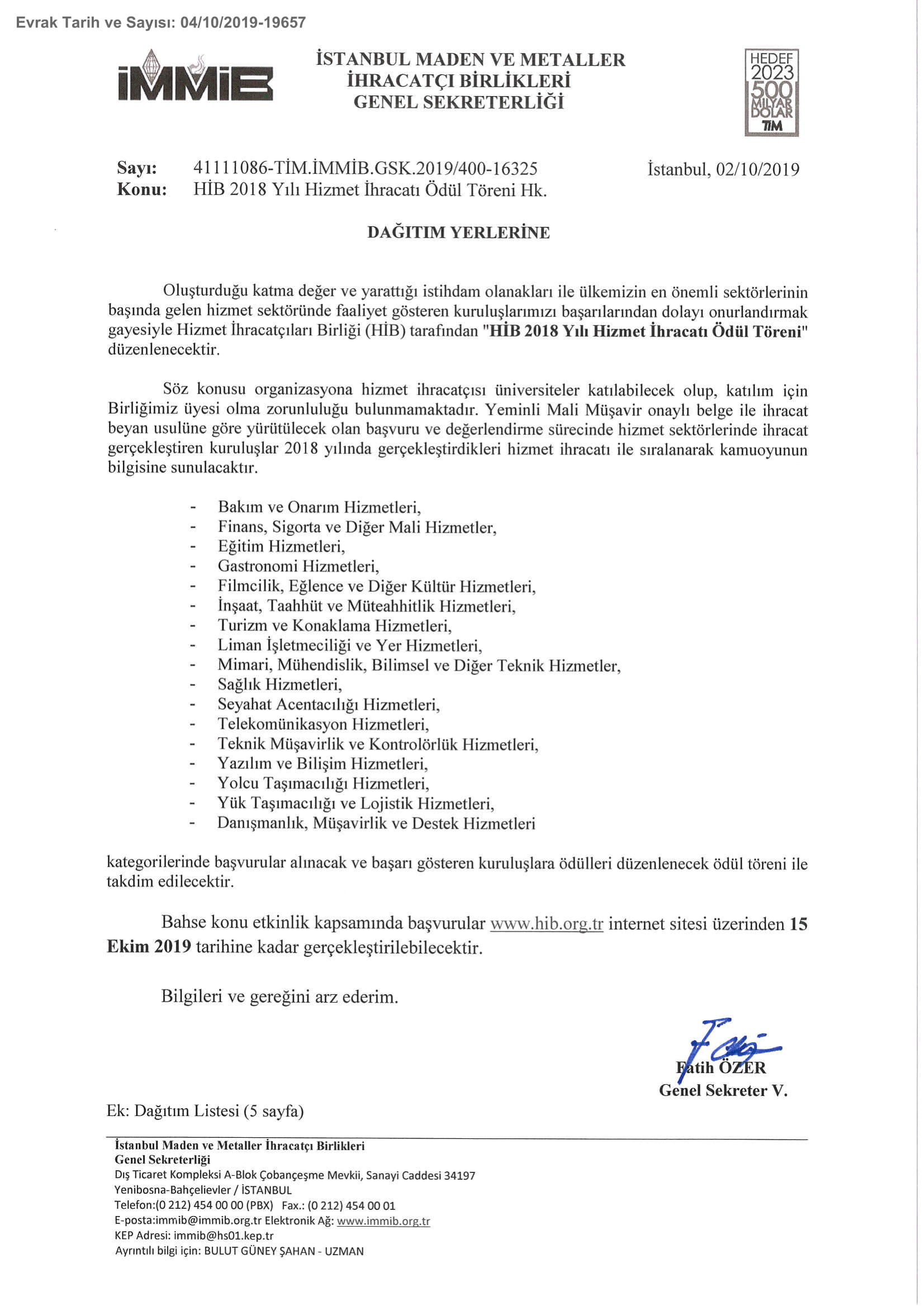 Ana Sayfa / Duyurular / HİB 2018 Yılı Hizmet İhracatı Ödül Töreni Hk.