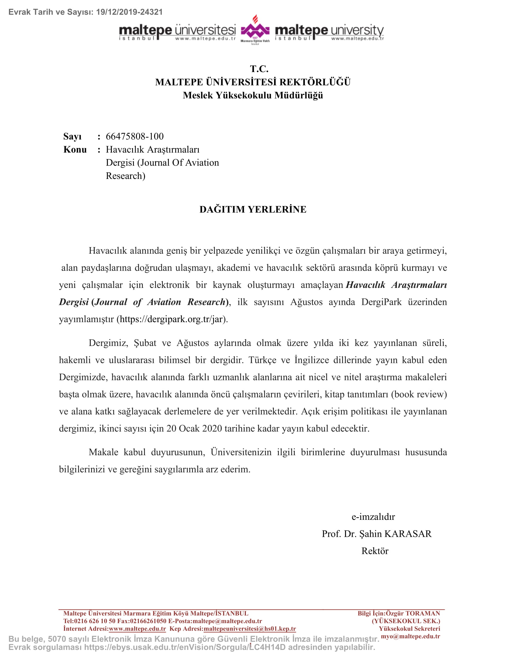 Ana Sayfa / Duyurular / Havacılık Araştırmaları Dergisi (Journal Of Aviation Research)