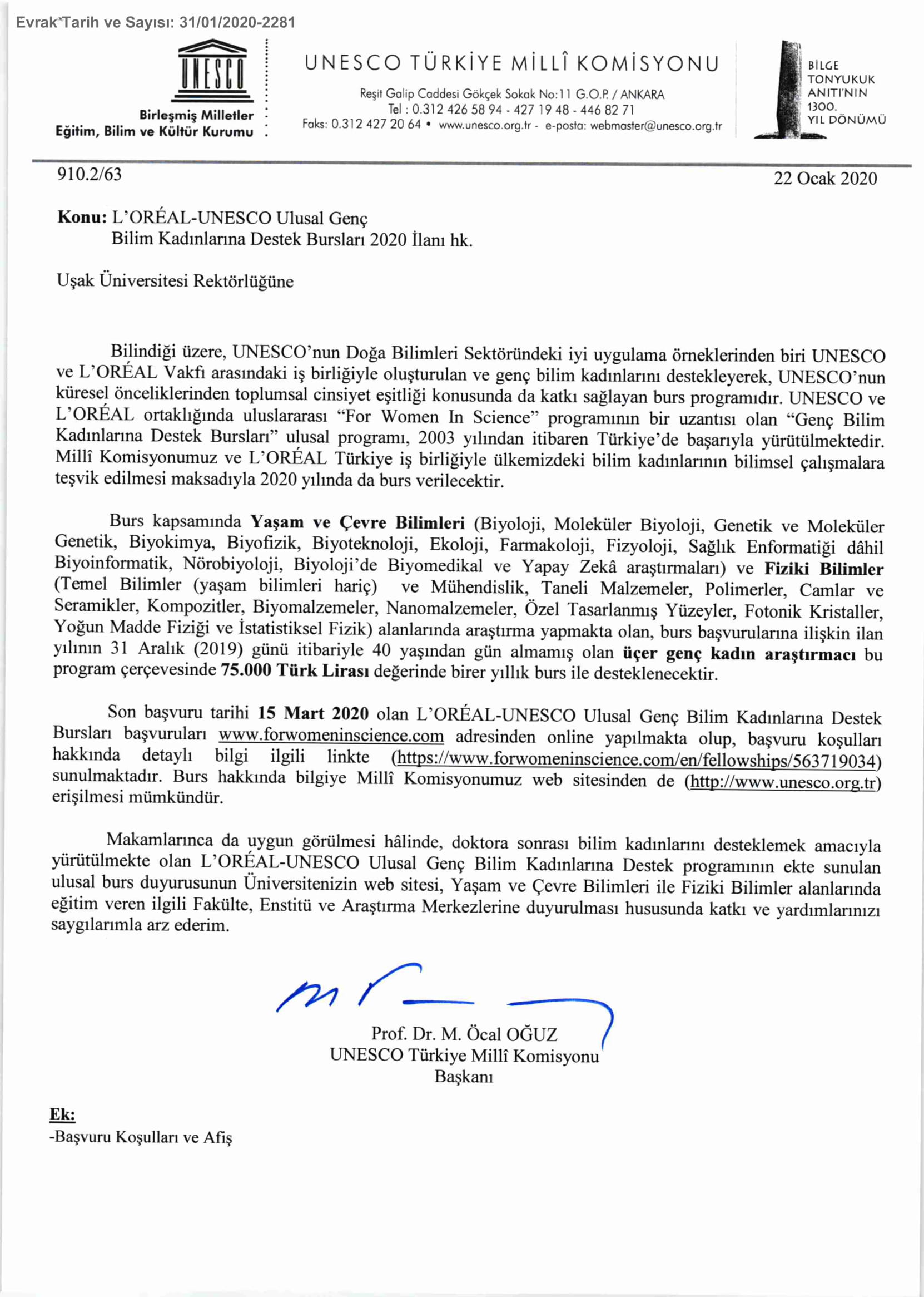 Ana Sayfa / Duyurular / L'OREAL-UNESCO Ulusal Genç Bilim Kadınlarına Destek Bursları 2020 İlanı