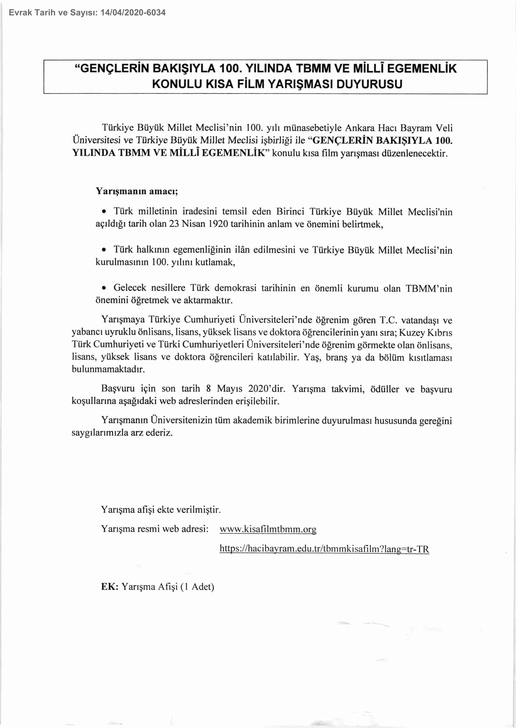 Gençlerin Bakışıyla 100. Yılında TBMM ve Milli Egemenlik Konulu Kısa Film Yarışması Duyurusu