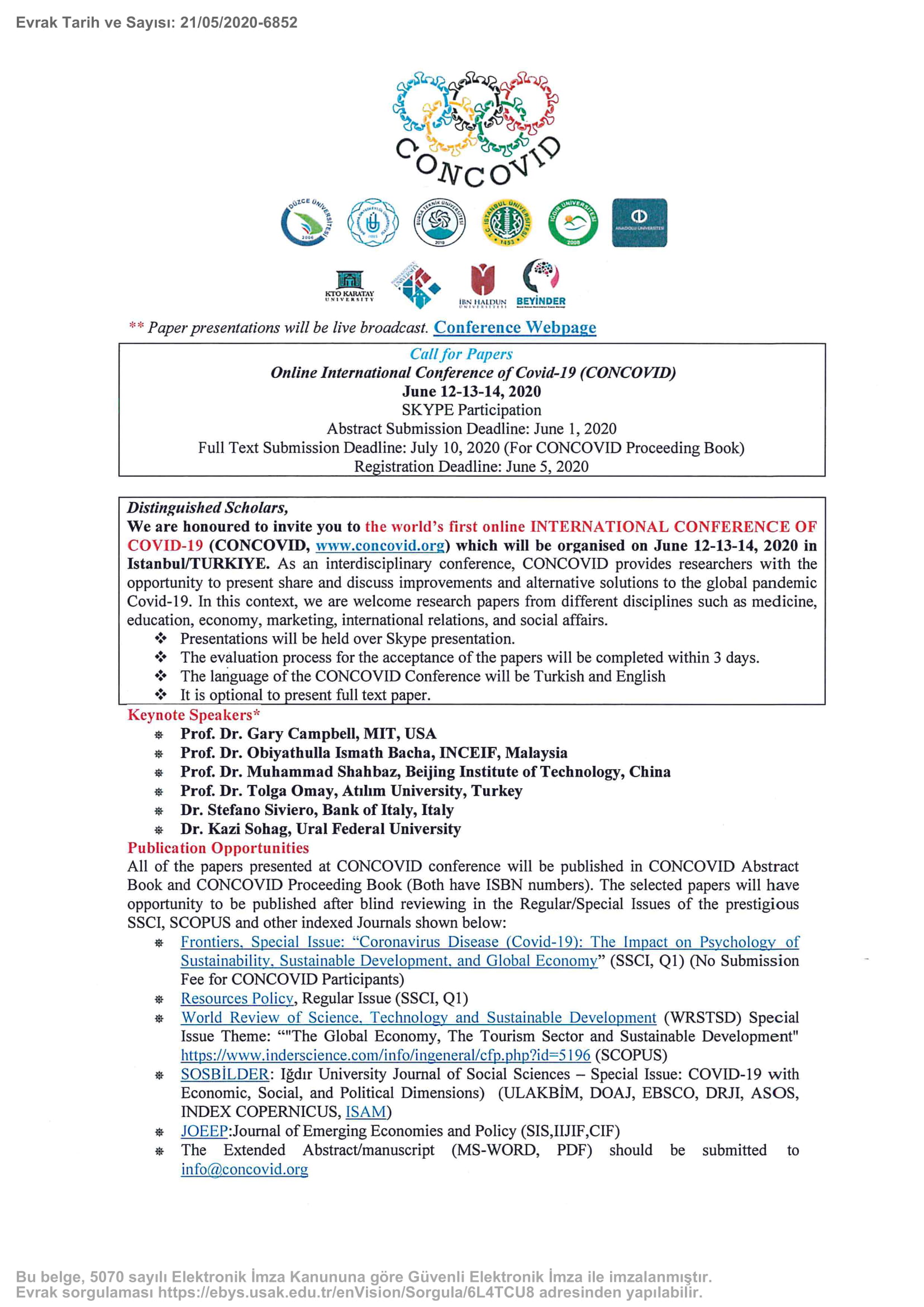12-13-14 Haziran 2020 tarihlerinde İstanbul'da düzenlenecek olan dünyanın ilk online COVİD-19 konferansı