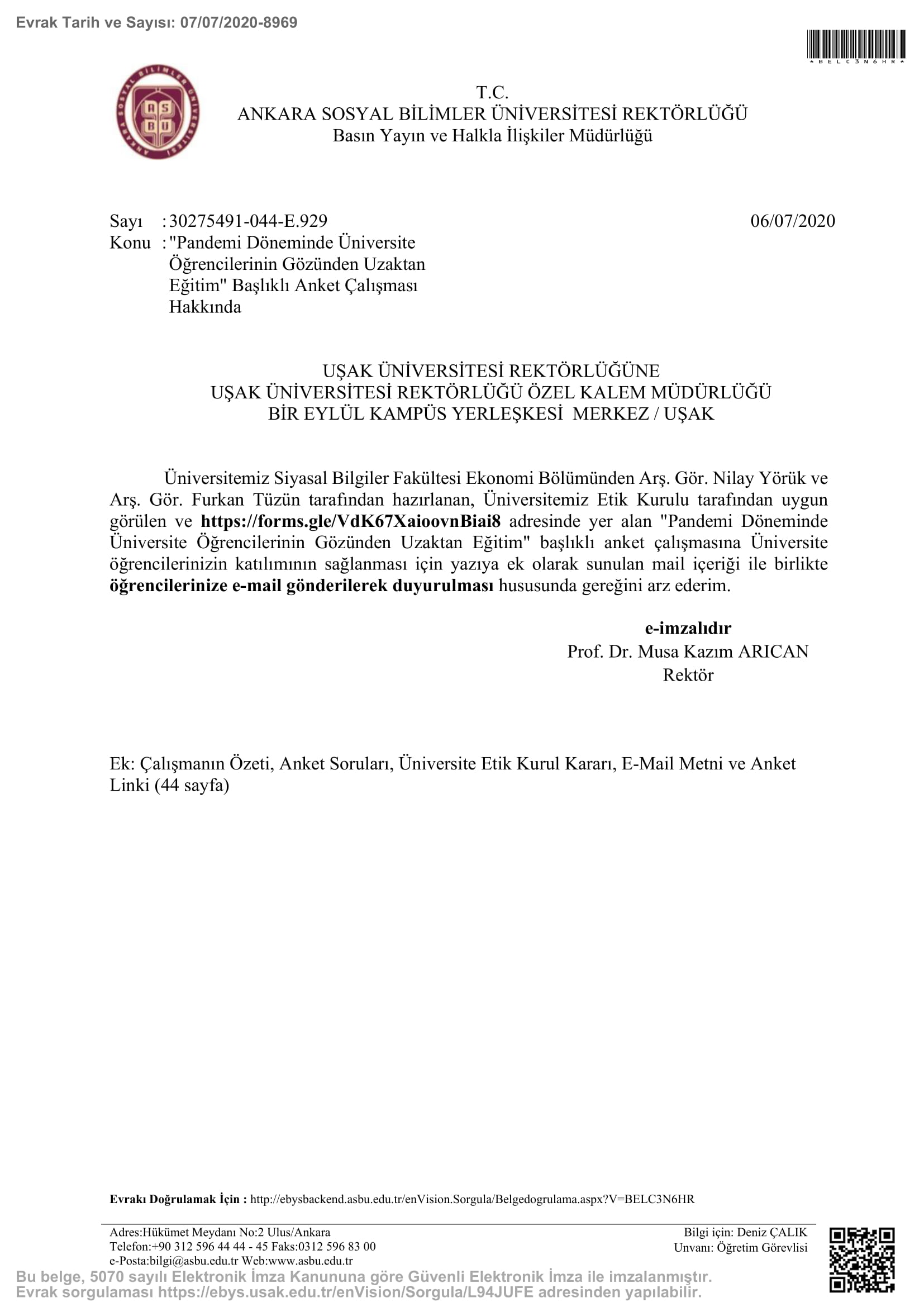"Pandemi Döneminde Üniversite Öğrencilerinin Gözünden Uzaktan Eğitim" Başlıklı Anket Çalışması Hakkında