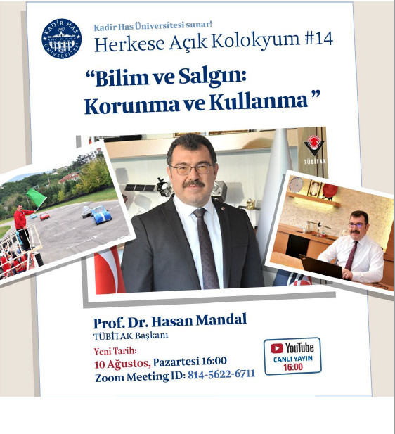 Kadir Has Üniversitesi Herkese Açık Online Kolokyumu kapsamında 5 Ağustos Çarşamba günü yapılması planlanan ve TÜBİTAK Başkanı Prof. Dr. Hasan Mandal'ın katılacağı "Bilim ve Salgın: Korunma ve Kullanma" konulu seminer 10 Ağustos 2020 Pazartesi günü saat 16:00'da yapılacaktır.