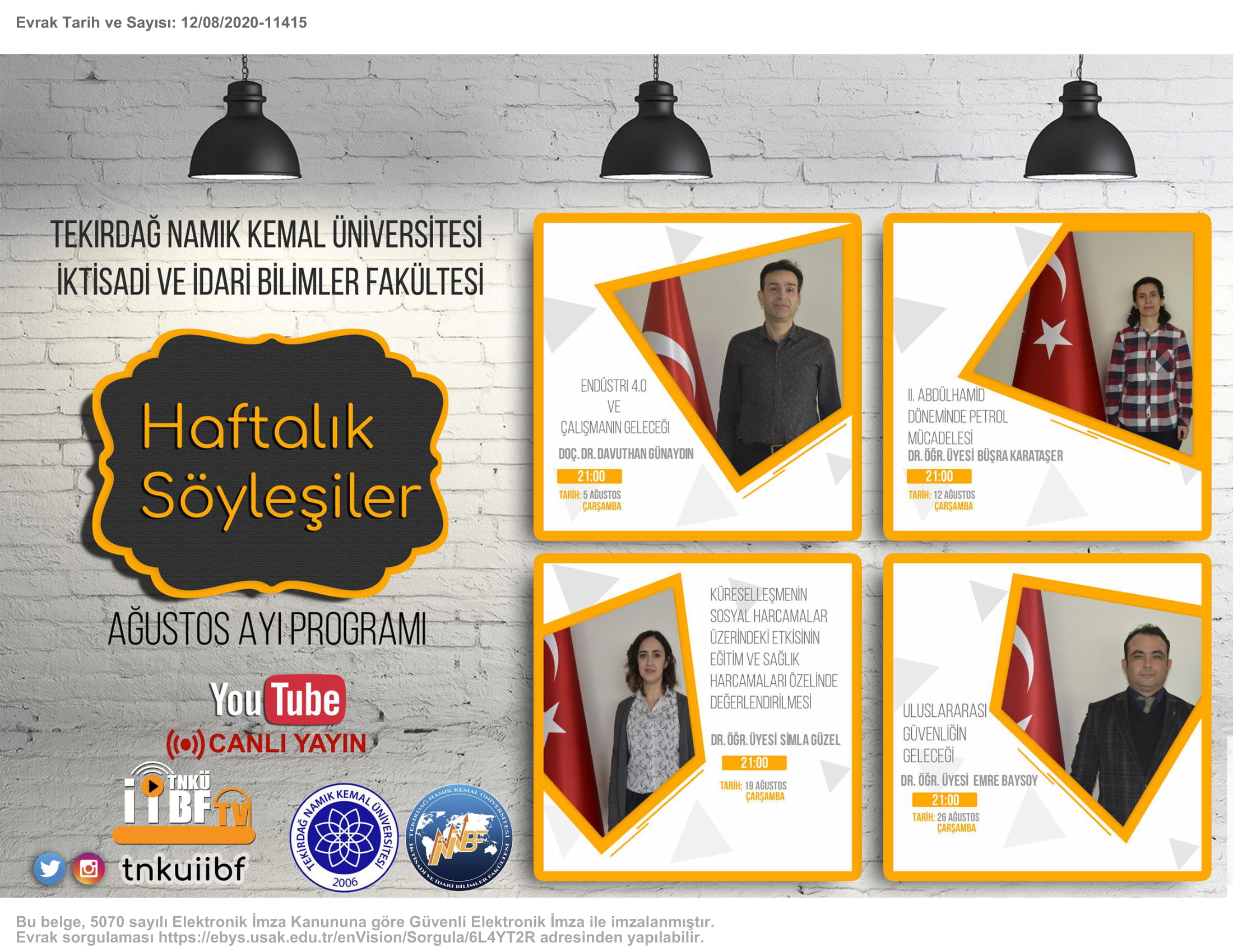 Tekirdağ Namık Kemal Üniversitesi İktisadi ve İdari Bilimler Fakültesi Haftalık Söyleşileri- Ağustos Ayı Programı / Canlı Yayın "TNKÜ İİBF TV" YouTube Kanalı