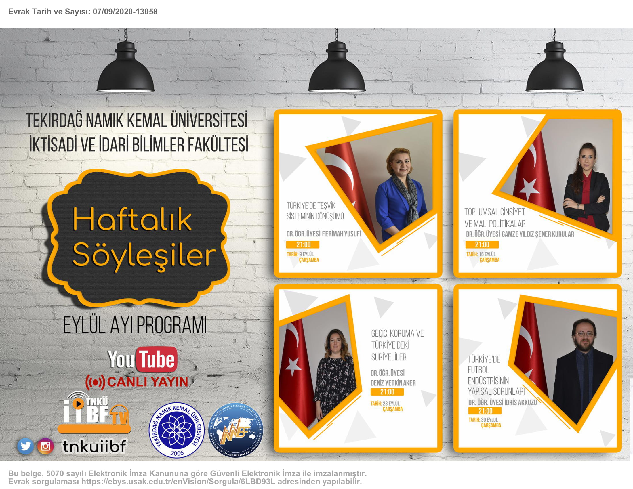 Tekirdağ Namık Kemal Üniversitesi İktisadi ve İdari Bilimler Fakültesi Haftalık Söyleşileri "EYLÜL" Ayı Programı/Canlı Yayın "TNKÜ İİBF" Youtube Kanalı