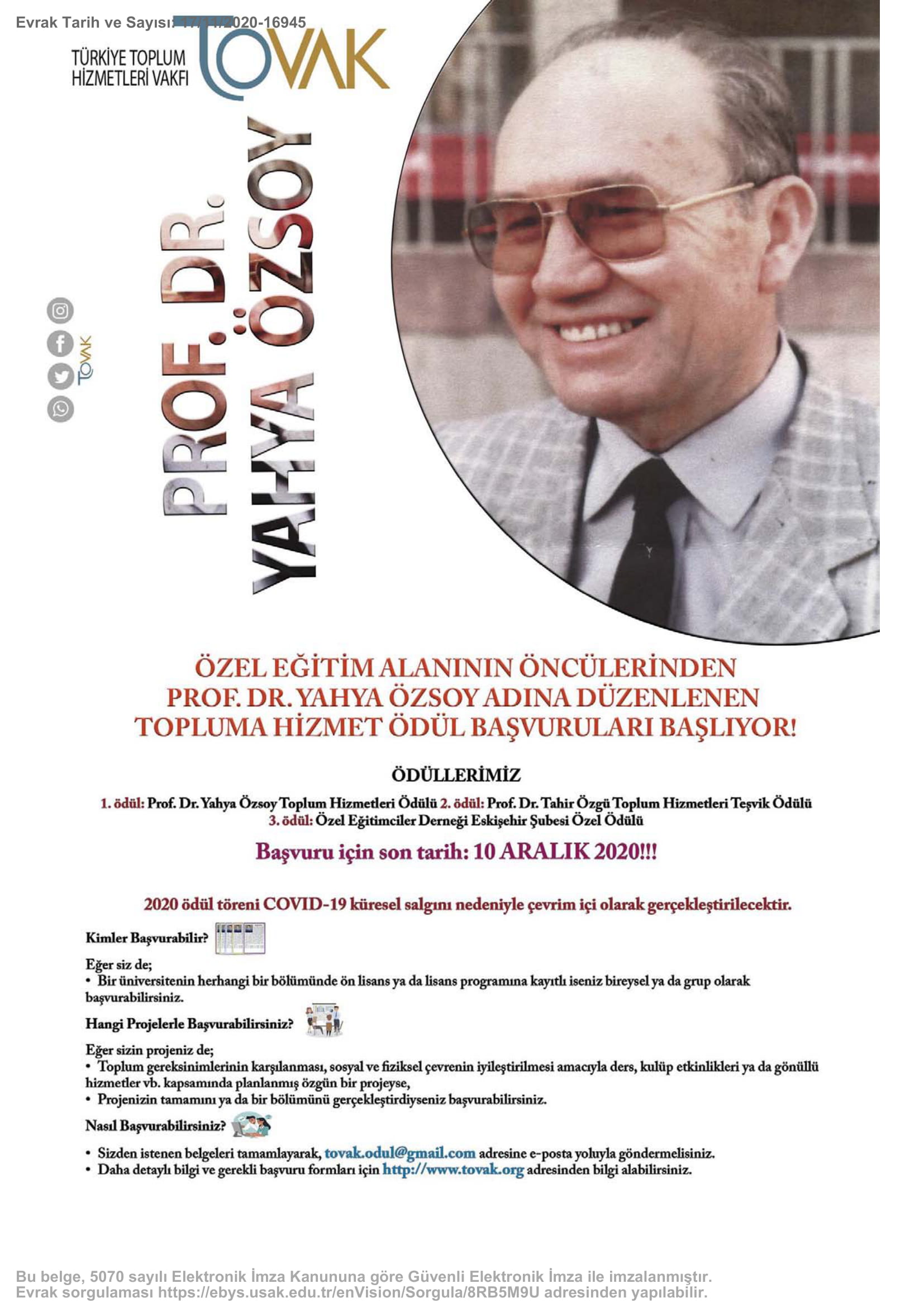 Ana Sayfa / Duyurular / Prof. Dr. Yahya Özsoy Topluma Hizmet Ödülü 2020