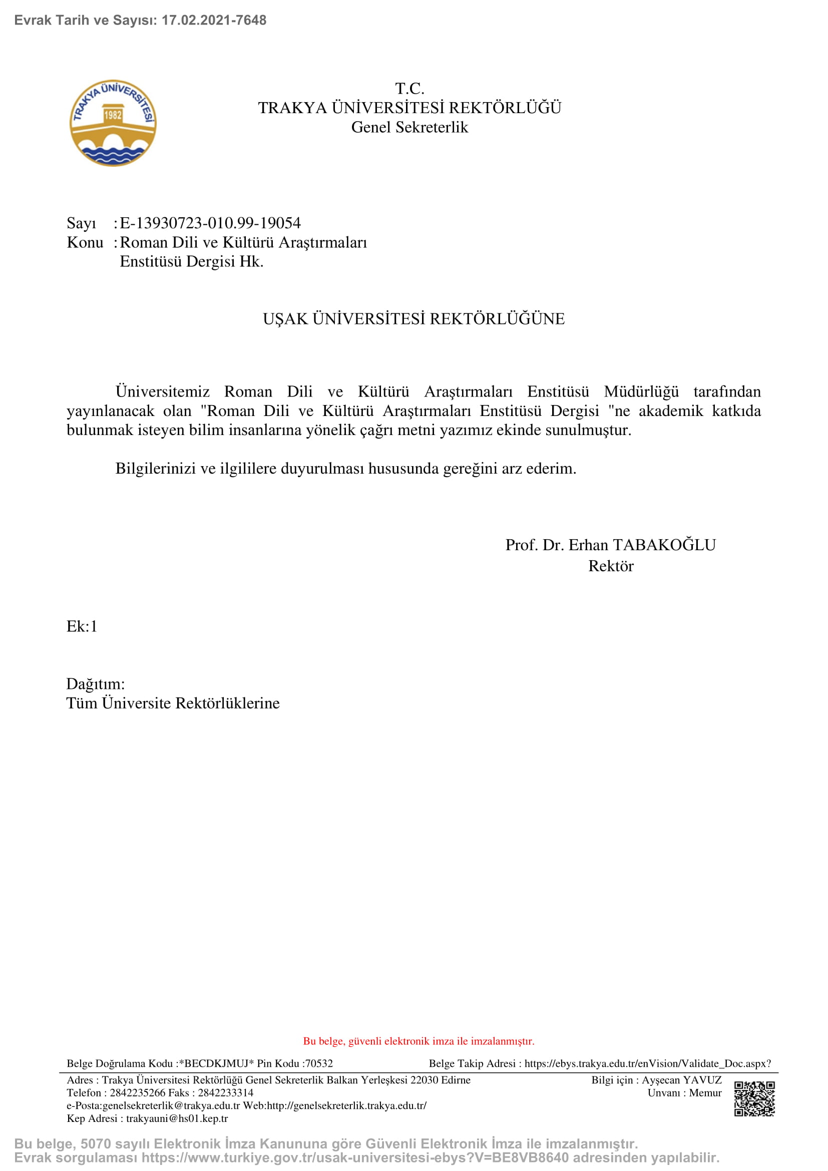 Roman Dili ve Kültürü Araştırmaları Enstitüsü Dergisi Hk.