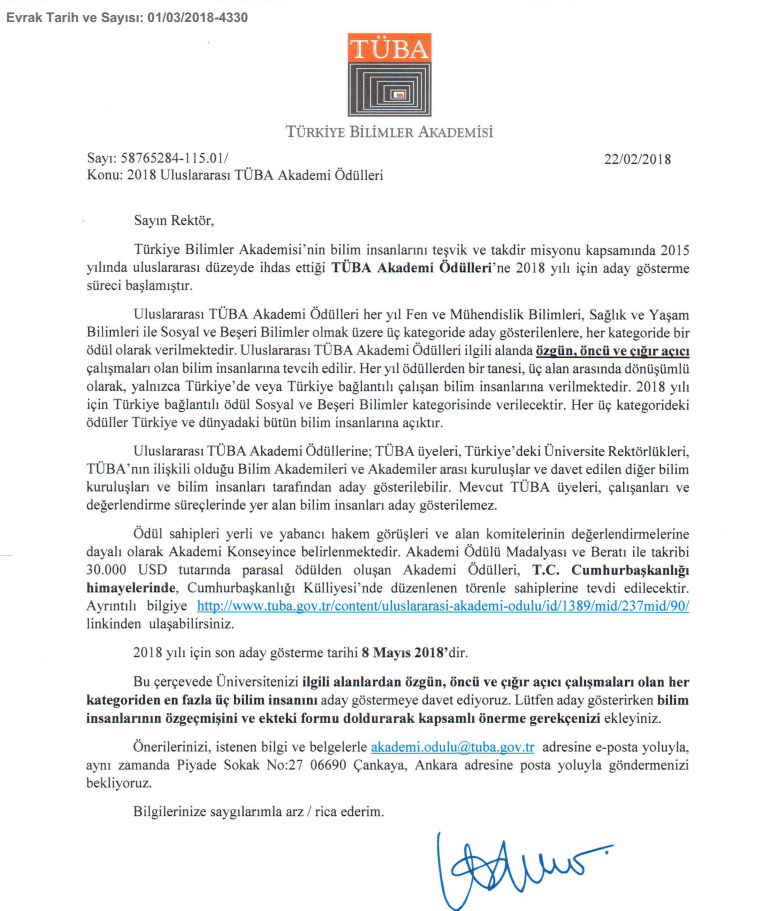 Ana Sayfa / Duyurular / 2018 Uluslararası TÜBA Akademi Ödülleri
