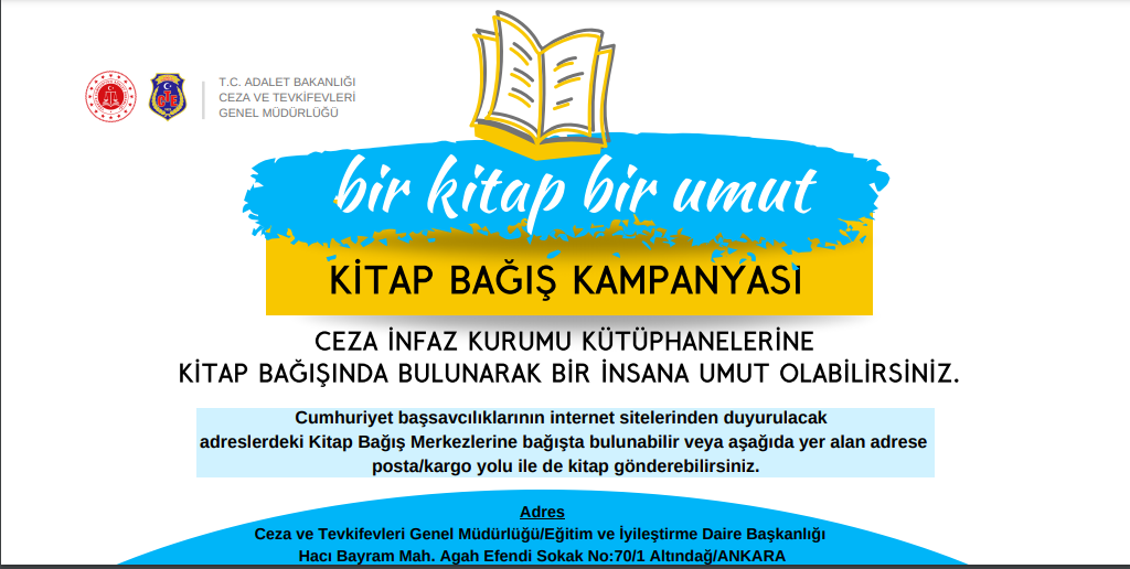 Adalet Bakanlığı ile Kültür ve Turizm Bakanlığı işbirliğiyle “Ceza İnfaz Kurumu Kütüphaneleri İçin Kitap Bağış Kampanyası” düzenlenecektir. Kitap bağışında bulunmak isteyen vatandaşlar, 31.05.2021-16.06.2021 tarihleri arasında “Uşak Merkez İsmet Paşa Cd. Orman Dairesi Yanı Kermes Alanı Kitap Kafe” adresindeki “Kitap Bağış Standı”nı, 08.30-19.00 saatleri arasında ziyaret edebilirler.