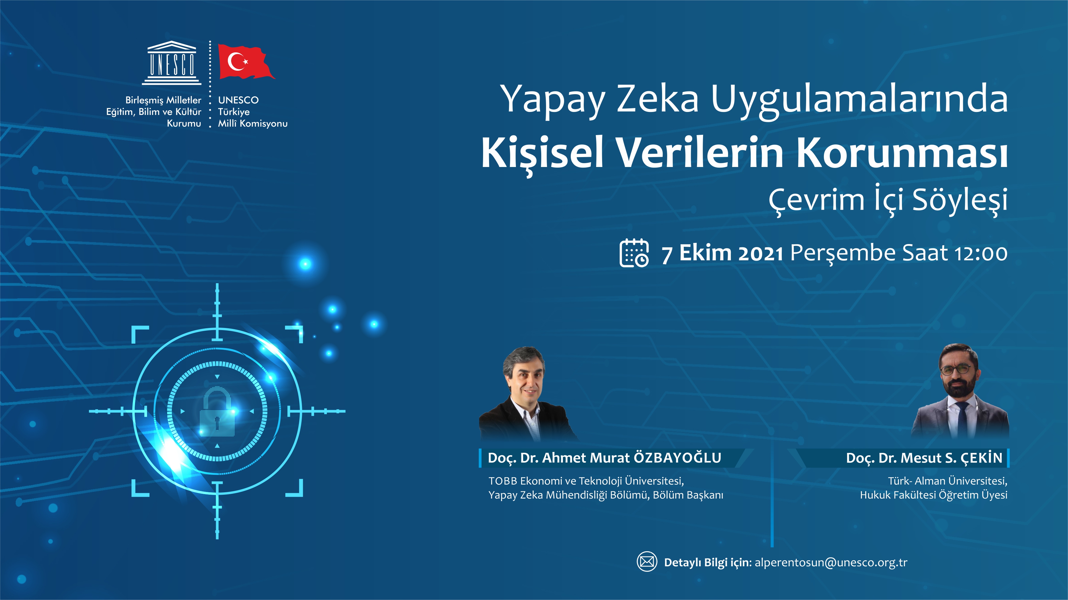 UNESCO Türkiye Millî Komisyonu tarafından 7 Ekim 2021 Perşembe günü, saat 12:00’da “Yapay Zeka Uygulamalarında Kişisel Verilerin Korunması” temalı söyleşi gerçekleştirilecektir. Söyleşi afişi ekte ve katılım için teknik bilgiler aşağıda yer almaktadır.
