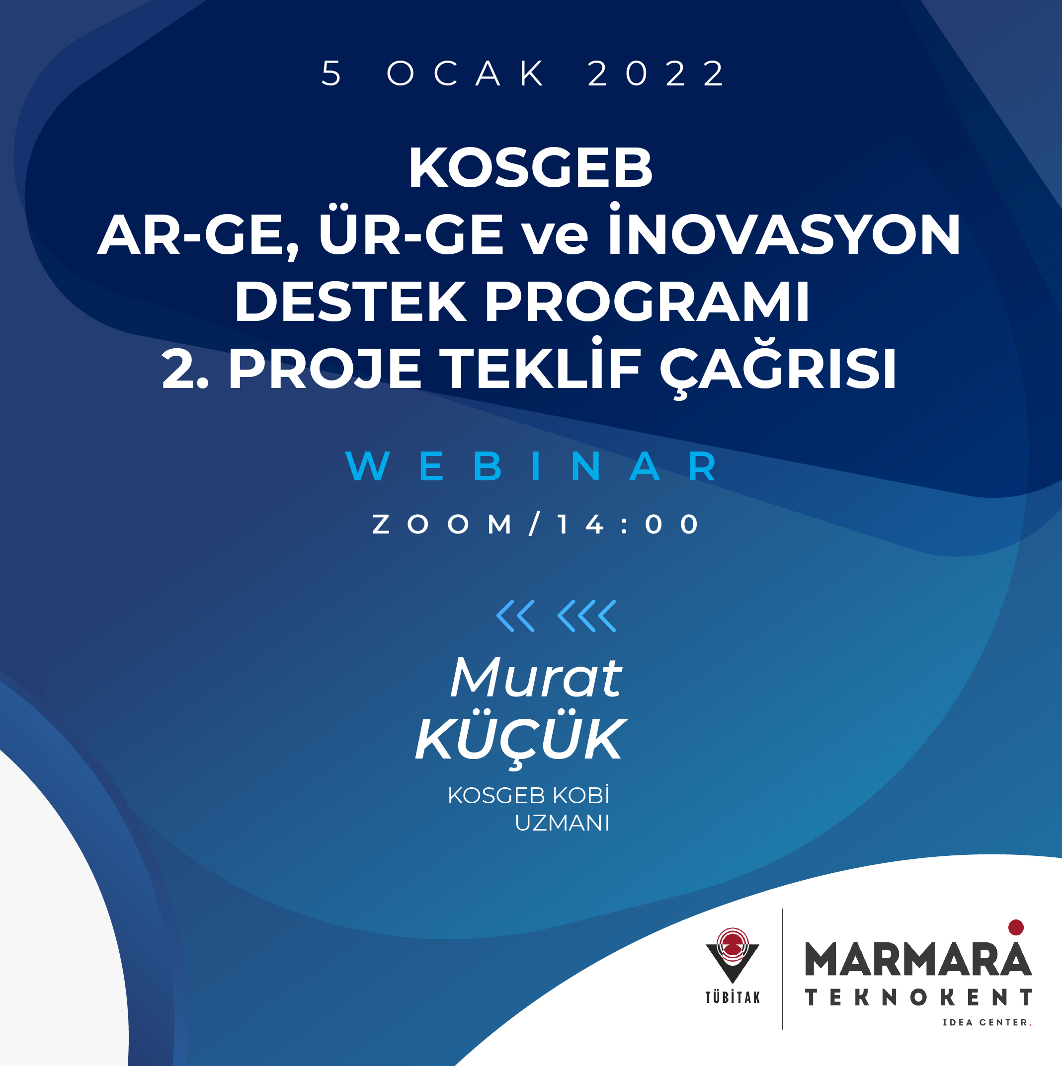 Marmara Teknokent İş Geliştirme ve Proje İzleme Birimi yürütücülüğünde 05 Ocak 2022 Çarşamba saat 14:00-15:00 arasında KOSGEB KOBİ Uzmanı Sayın Murat Küçük tarafından “KOSGEB – Ar-Ge, Ür-Ge ve İnovasyon Destek Programı 2. Proje Teklif Çağrısı ” konulu webinar düzenlenecektir.
