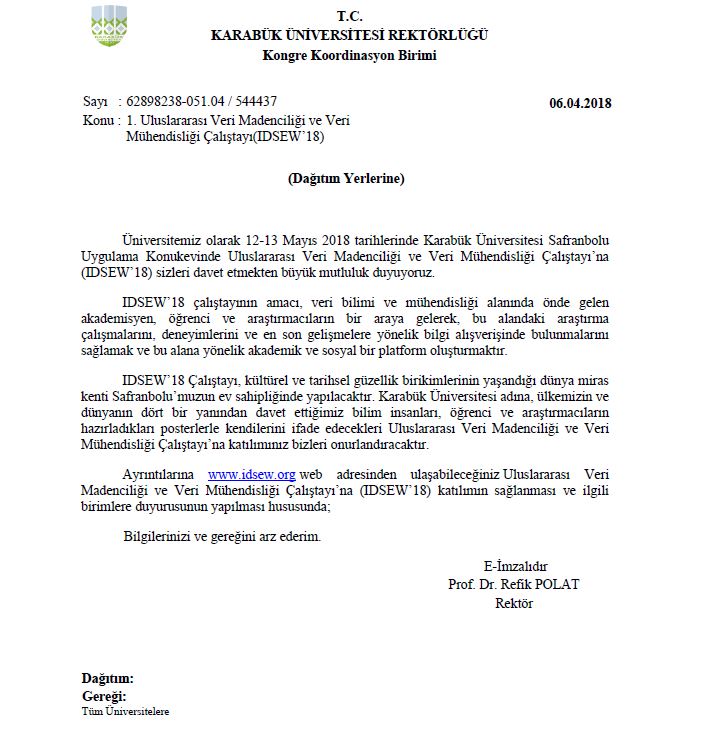 1. Uluslararası Veri Madenciliği ve Veri Mühendisliği Çalıştayı(IDSEW’18)