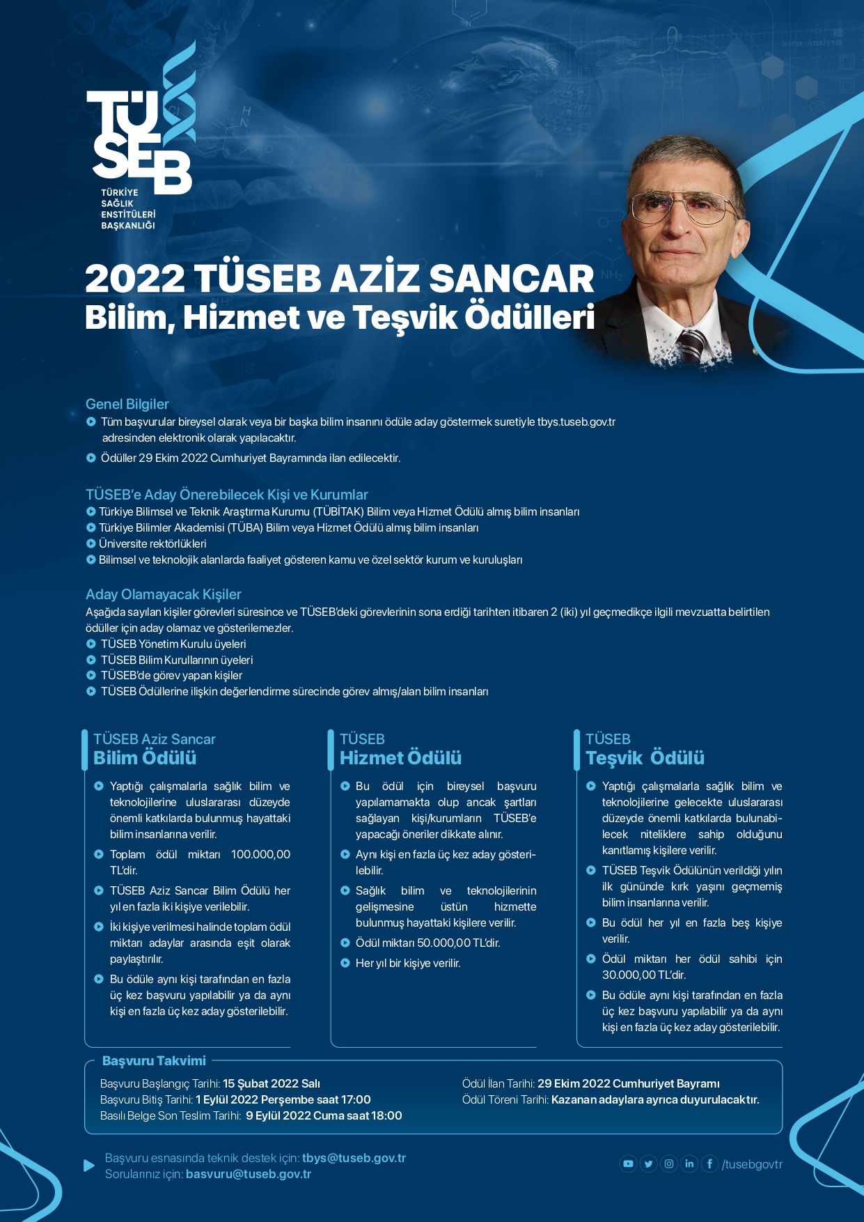 Ana Sayfa / Duyurular / TÜSEB Aziz Sancar Bilim, Hizmet ve Teşvik Ödülleri