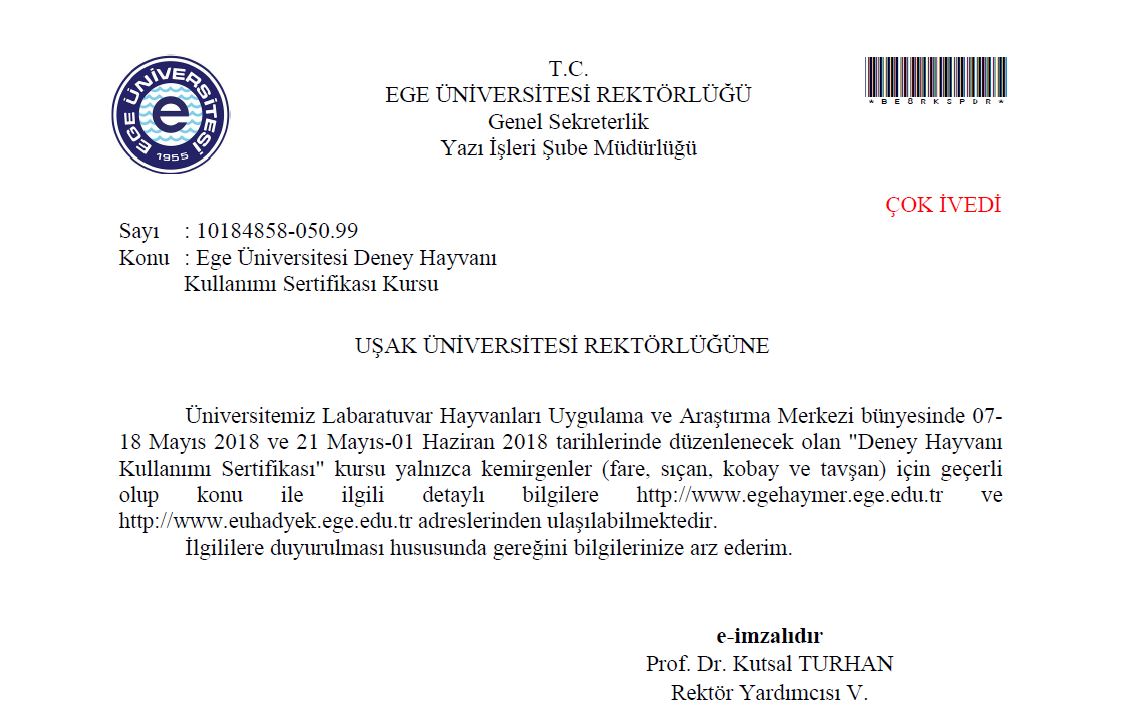 Ana Sayfa / Duyurular / Ege Üniversitesi Deney Hayvanı Kullanımı Sertifikası Kursu
