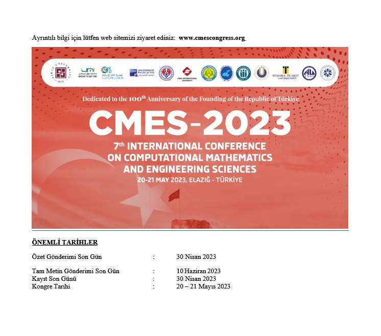Fırat Üniversitesi Fen Fakültesi Matematik Bölümü tarafından 20-21 Mayıs 2023 tarihlerinde Elazığ ilinde düzenlenecek olan CMES-2023 7. Uluslararası Uygulamalı Matematik ve Mühendislik Bilimleri Kongresi, yurt içinden ve yurt dışından nitelikli bilim insanlarını bir araya getirerek, bilim insanlarının değerli araştırmalarını birbirleriyle paylaşmayı amaçlayan uluslararası nitelikli bilimsel bir kongredir. Çalışmalar Çift Kör Hakem yöntemiyle hassas bir şekilde değerlendirilecektir. Kongre gerek komiteler gerekse de katılımcı ülke çeşitliliği bakımından doçentlik ve profesörlük kriterlerini sağlamaktadır. Bildiriler Türkçe ve İngilizce dillerinde sunulabilir. Kongre sonrasında tam metin tüm bildiriler ISBN'li bildiri kitabında yayınlanacaktır.