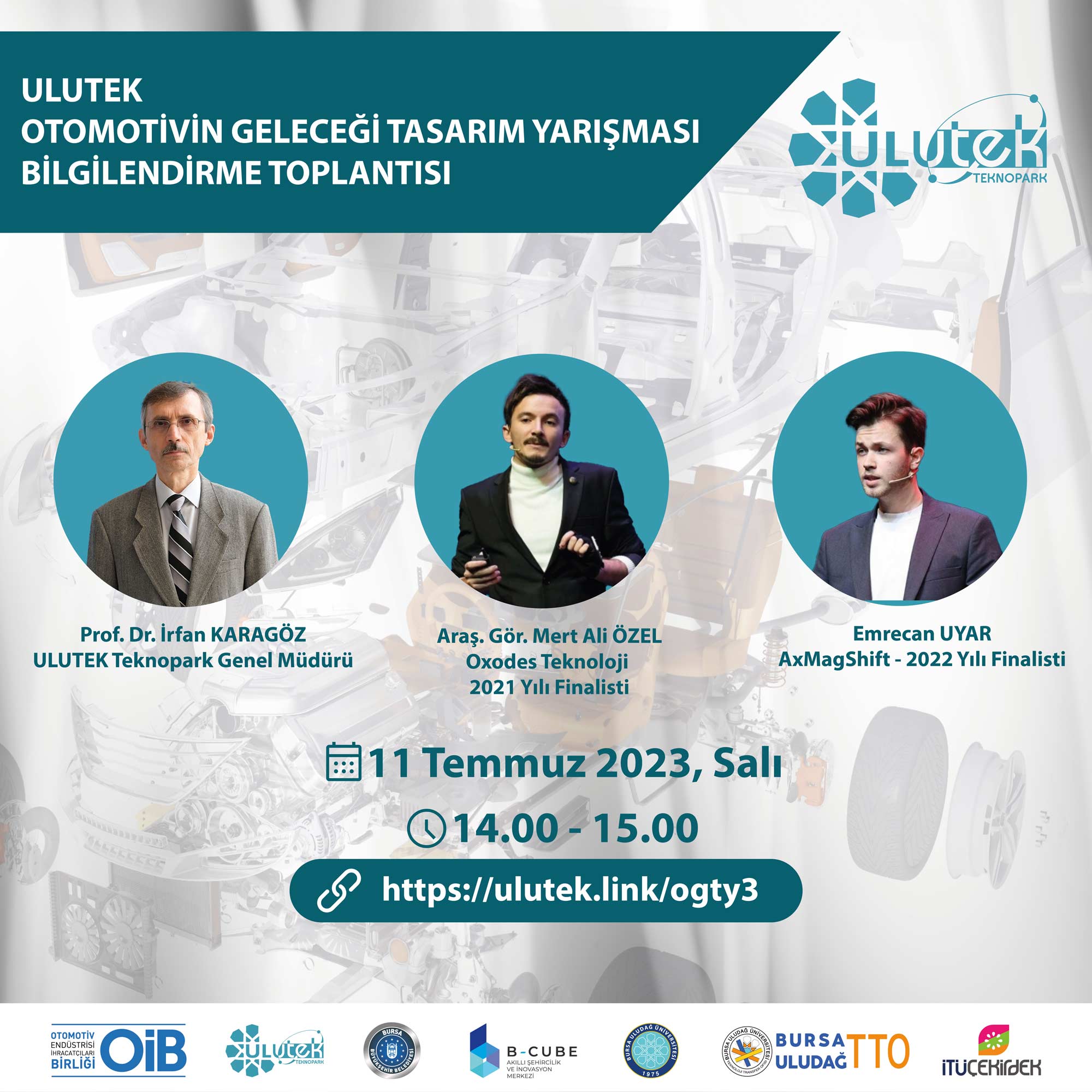 Son başvuru tarihi 1 Ağustos 2023 olan "Otomotivin Geleceği Tasarım Yarışması"nın ULUTEK bilgilendirme toplantısı 11 Temmuz Salı günü saat 14.00'da çevrimiçi olarak gerçekleşecektir. Yarışma, otomotiv sektörüne yönelik yenilikçi fikri olan tüm girişimci ve girişimci adaylarının katılımına açıktır ve katılım ücretsizdir.