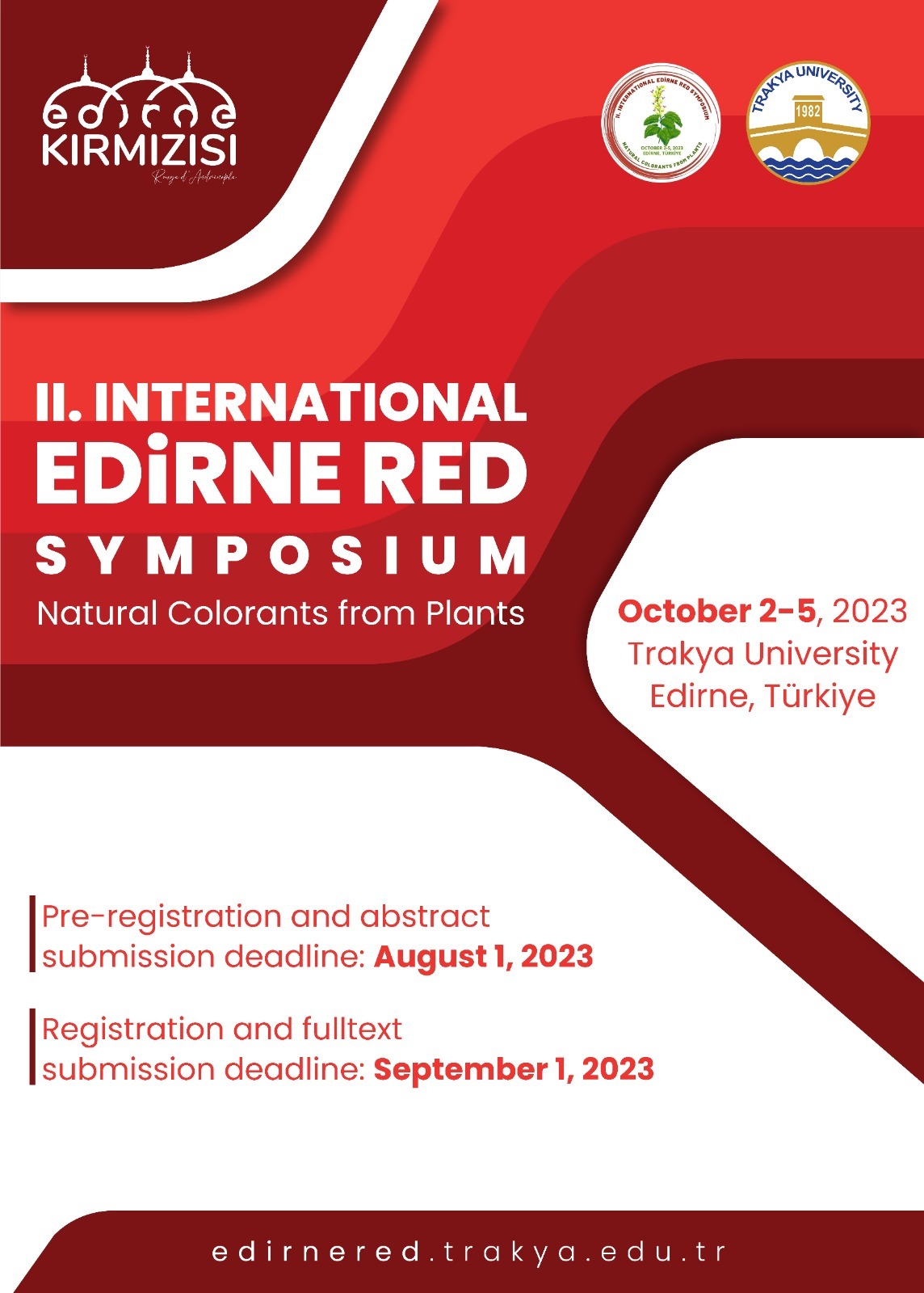 On behalf of the Organizing Committee, I am honored to invite you to attend the 2nd International Edirne Red Symposium on “Natural Colorants from Plants” that will be held between October 2-5, 2023 and hosted by Trakya University, Edirne-Türkiye. It is a great chance for the academicians and the experts for discussing recent advancements, exchanging ideas and exploring new research opportunities on dye plants and their use.