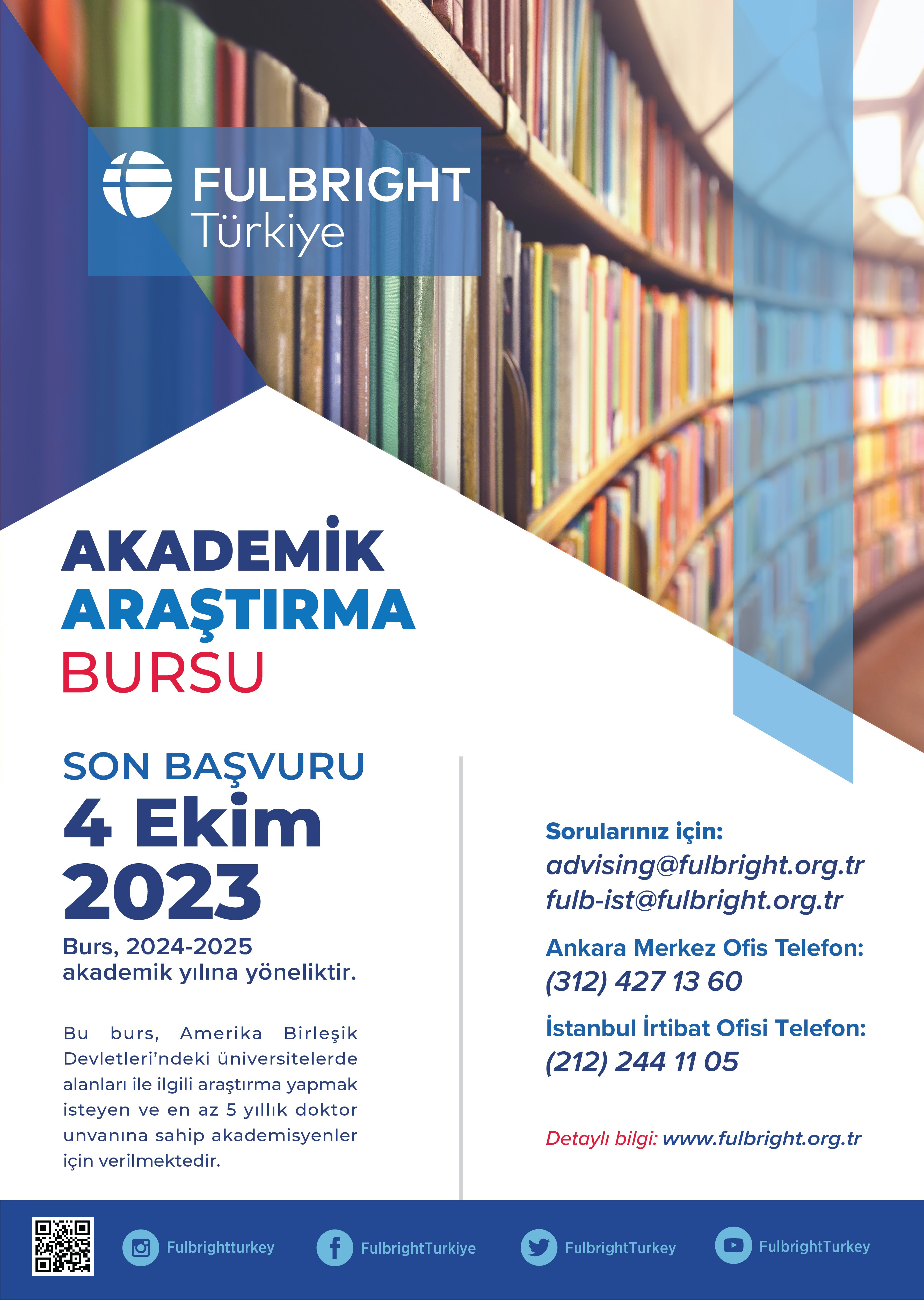 Son başvuru tarihi 4 Ekim 2023 olan Akademik Araştırma Bursuna doktorasını beş yıldan evvel almış akademisyenler, A.B.D. de alanlarıyla ilgili araştırma yapmak için başvurabilirler.