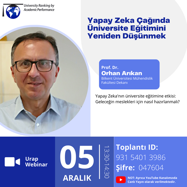 ODTÜ Enformatik Enstitüsü URAP Araştırma Laboratuvarı tarafından çevrim içi olarak düzenlenen 05 Aralık 2023 – 13:30 tarihli Bilkent Üniversitesi Mühendislik Fakültesi Dekanı Prof. Dr. Orhan Arıkan’ın vereceği “Yapay Zeka Çağında Üniversite Eğitimini Yeniden Düşünmek” başlıklı seminer.